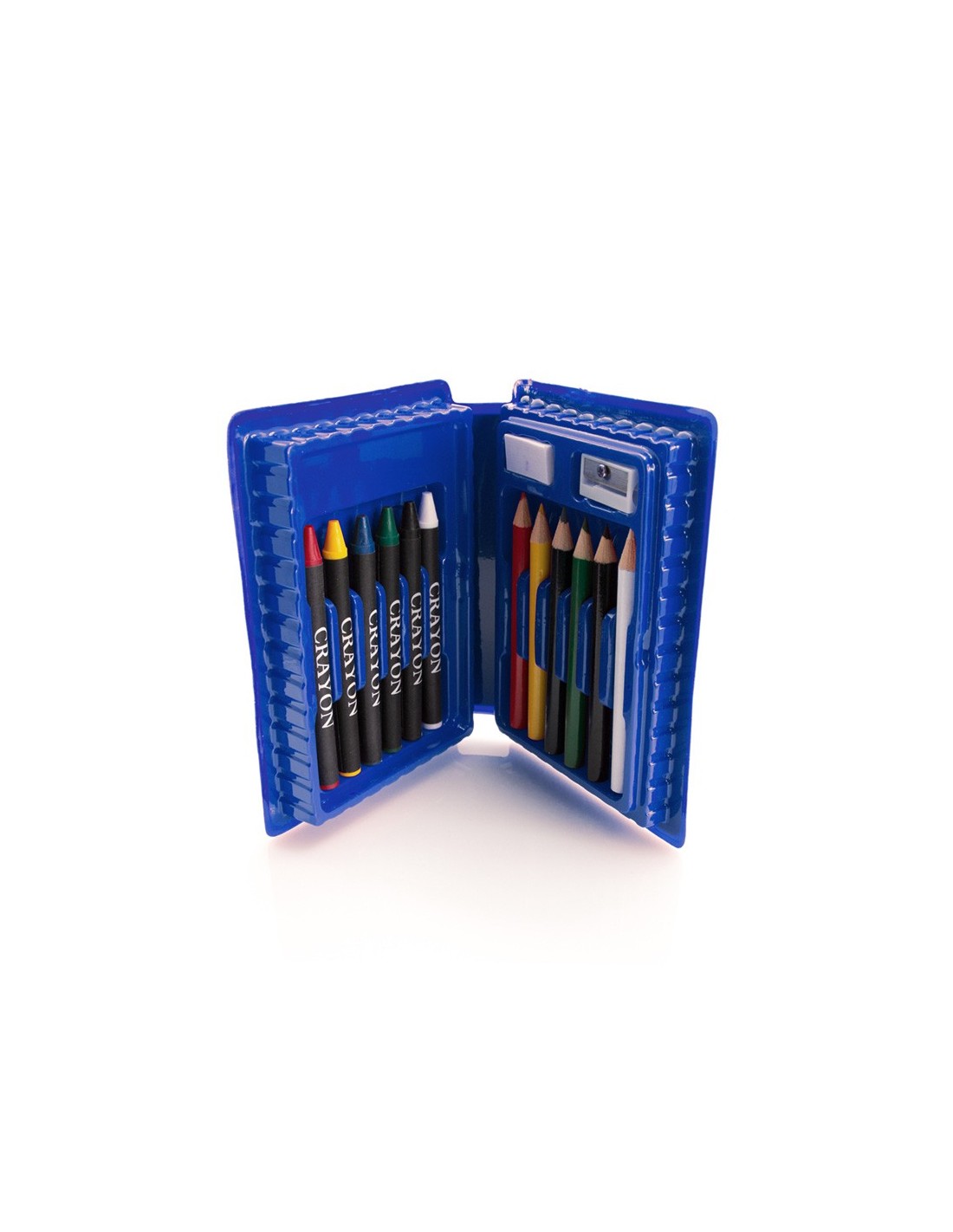 Set de 14 piezas en estuche con resistente cuerpo acabado en brillantes colores e interior con compartimentos de seguridad. Contiene goma, sacapuntas, ceras y lápices de madera de cuerpo cilíndrico en variados colores.