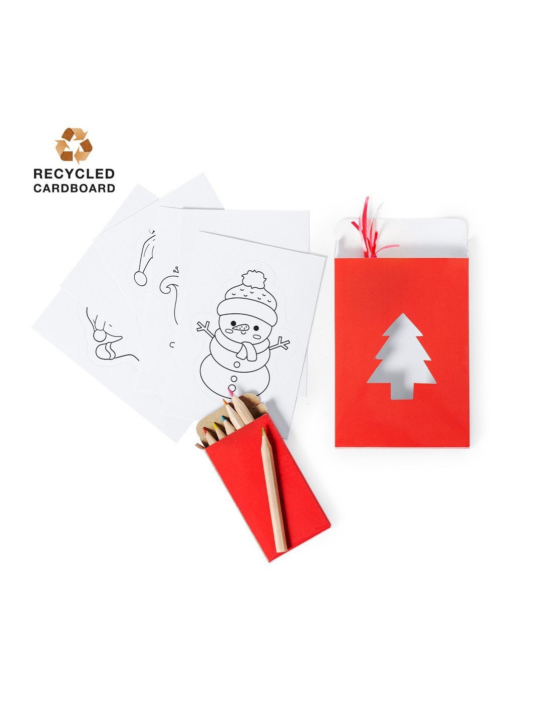 Set de adornos con 6 originales diseños navideños para colorear y decorar el árbol de navidad. Incluye 6 lápices de madera en diferentes colores. Fabricados en cartón y presentados en una bolsa reciclada.