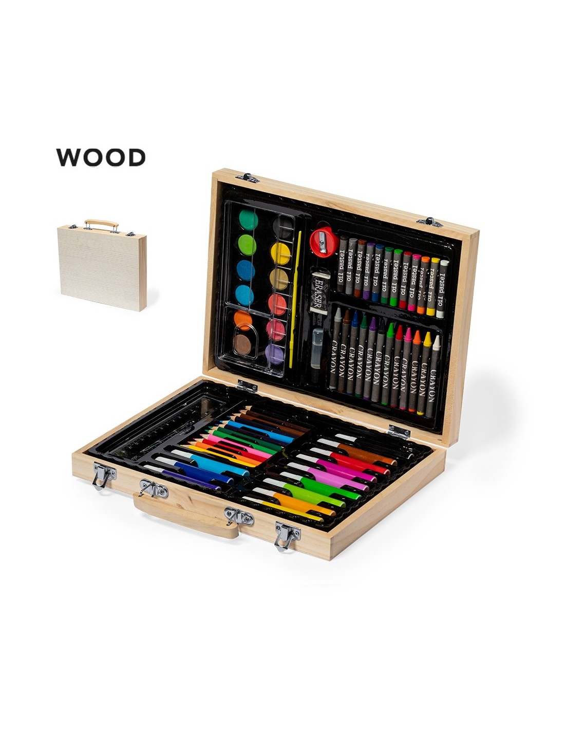 Completo maletín para colorear fabricado en madera, con cómoda asa de transporte. Contenido: - 12 rotuladores- 12 lápices- 12 ceras crayón - 12 ceras al aceite - Placa de acuarelas con pincel y paleta - Sacapuntas- Goma- Tarro de pegamento- Regla