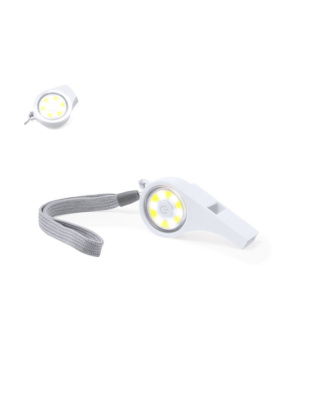 Ingenioso silbato multiusos con luz integrada en el cuerpo. Fabricado en resistente ABS, con 6 luces COB y varias posiciones de iluminación: fija con dos niveles de intensidad e intermitente para una mayor visibilidad. Cordón para un cómodo transporte y está alimentado por una pila de botón (incluida). Presentado en caja de diseño kraft.