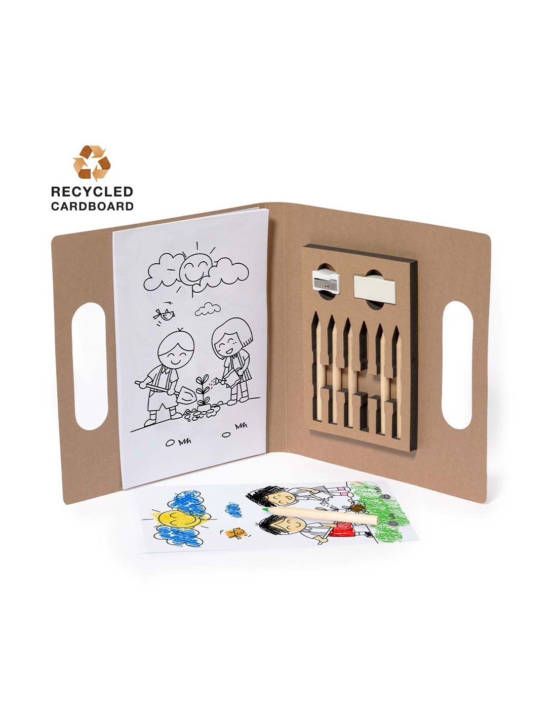 Set para colorear hecho en cartón reciclado. Divertido conjunto de dibujos y lápices de colores en una práctica carpeta con asas. Incluye:.Bloc de 20 hojas con dibujos de naturaleza para colorear..Caja con 6 lápices de madera con minas en multitud de colores..Sacapuntas..Goma de borrar.