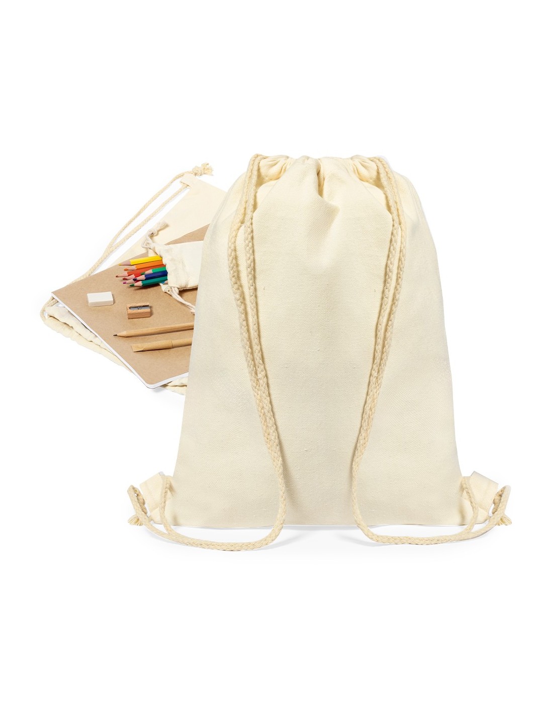 Set de escritura y colores con cuaderno. Divertido conjunto de artículos fabricados en madera compuesto por lápices con minas en varios colores, sacapuntas, bolígrafo fabricado en cartón reciclado y goma. Presentado en una práctica bolsa de algodón 100%.