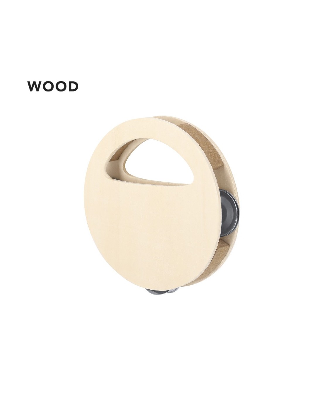 Pandereta de madera. De forma circular con práctica asa para un fácil agarre y 3 platillos dobles metálicos. Con amplia superficie de impresión. Elaborado con elementos vegetales para así fomentar la utilización de materias primas naturales y reducir las emisiones contaminantes.