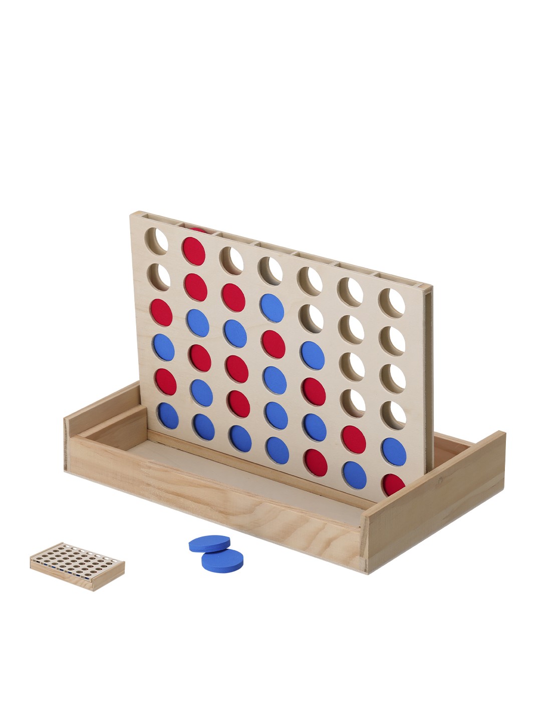 Juego de 4 en raya fabricado en madera. Ideal para disfrutar en cualquier momento, ya sea en casa o al aire libre, con amigos en familia o en eventos. Incluye 42 fichas, 21 fichas en color azul y en color rojo. Fácil de montar y desmontar, ofrece un compartimento para guardar fichas. Un juego que combina diversión y estética.