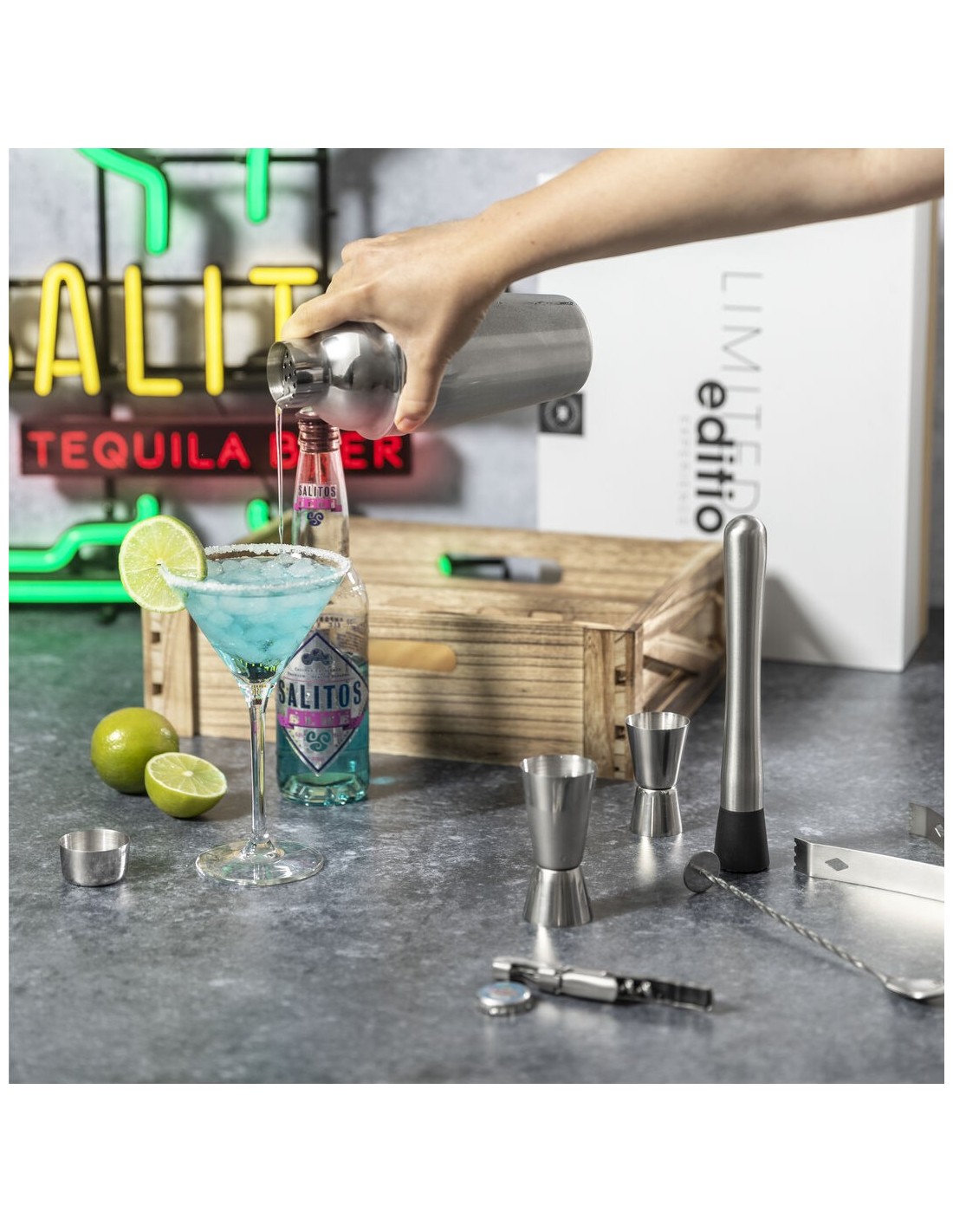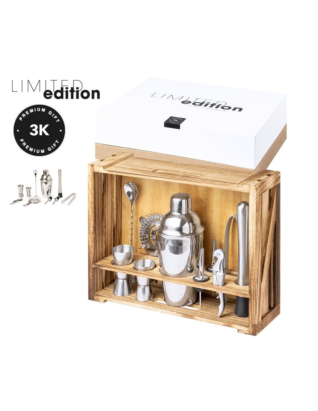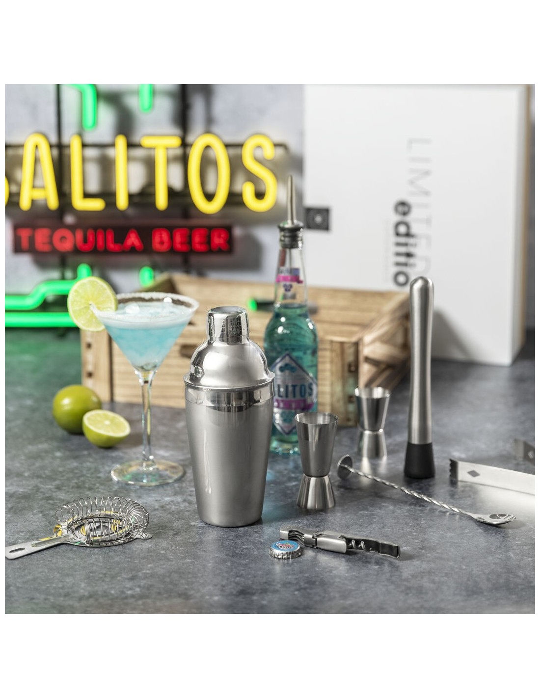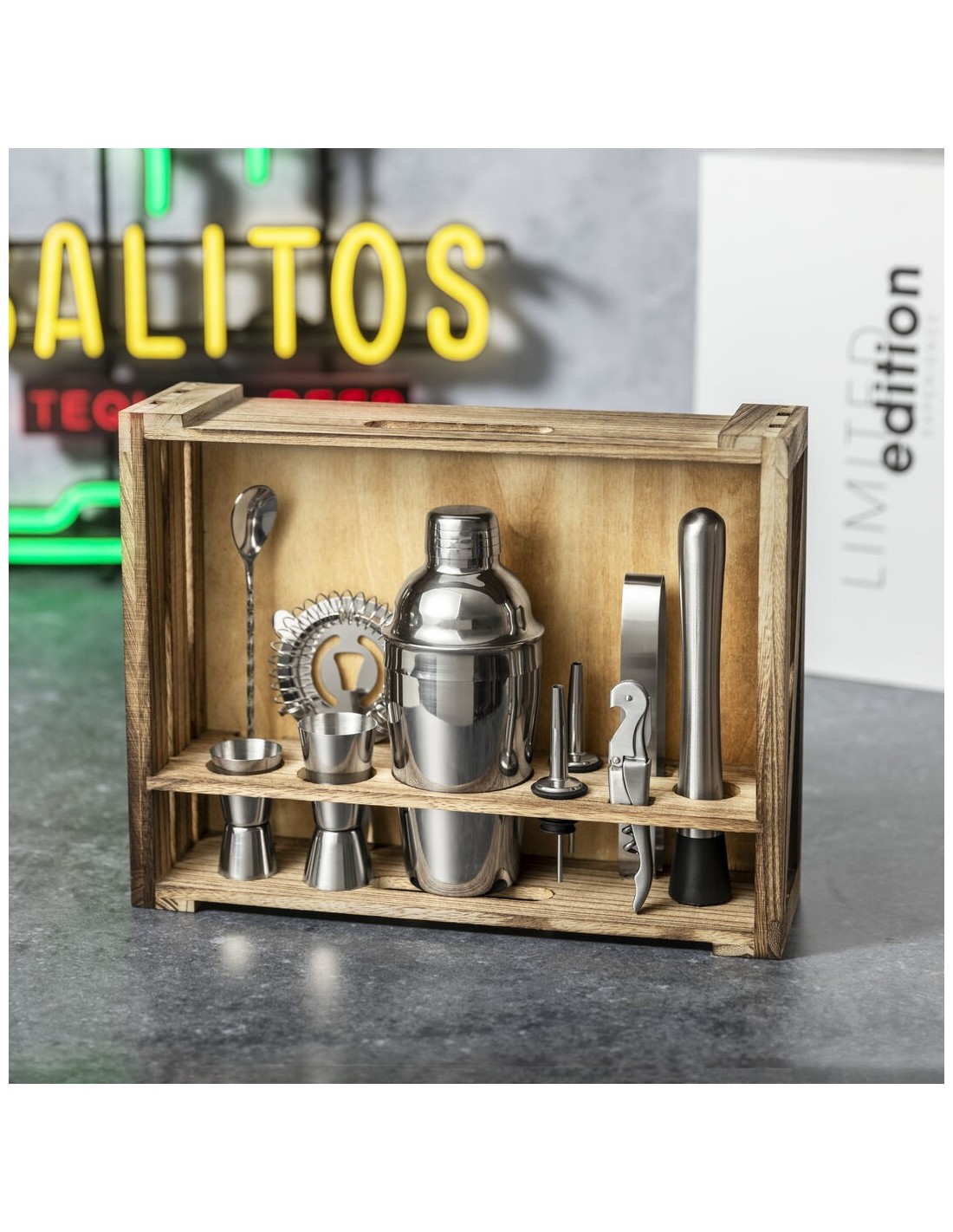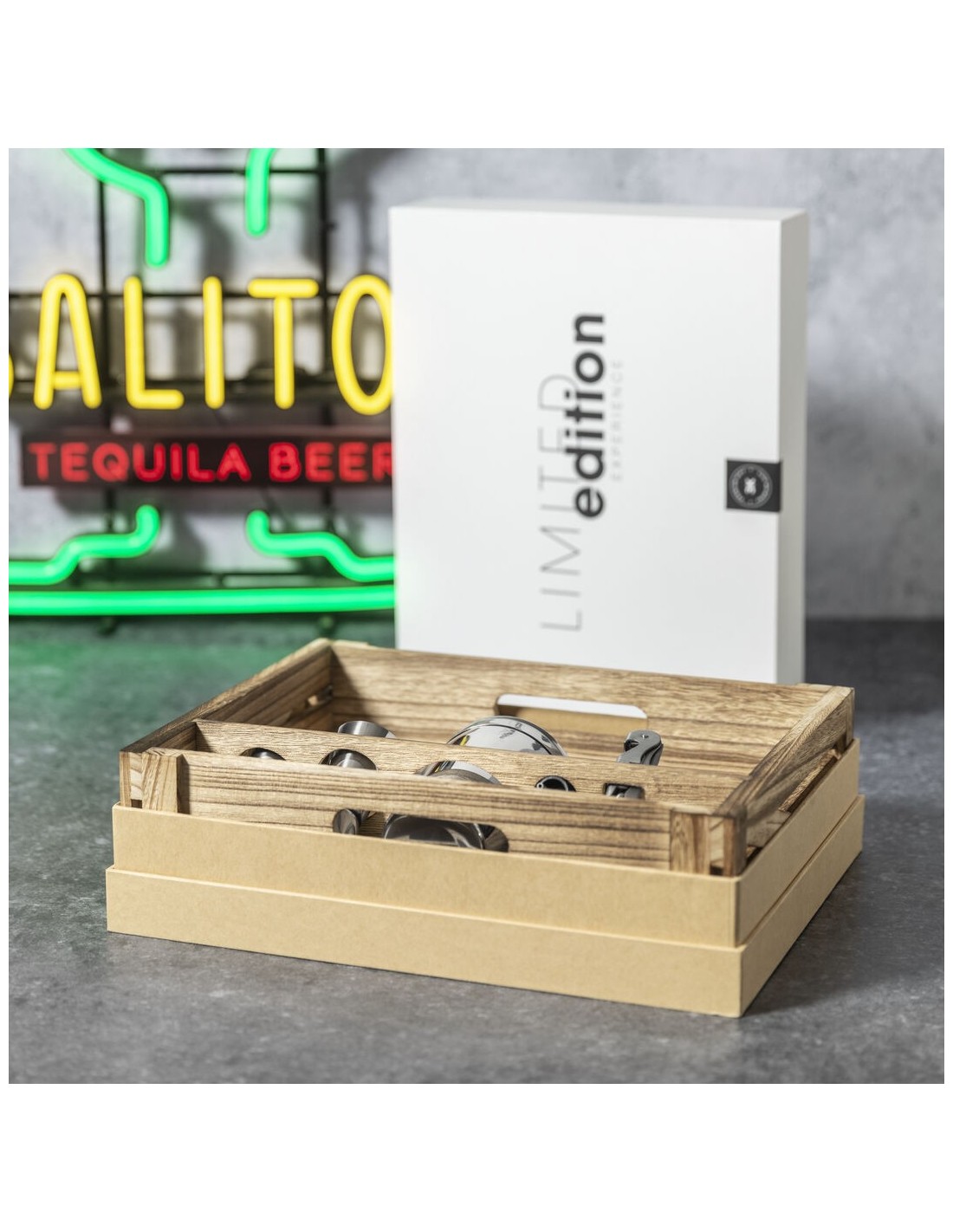 Elegante Set de Cóctel Limited Edition. Un sorprendente set que combina conceptos modernos a la par que tradicionales. Incluye todos los utensilios esenciales para configurar los mejores cócteles en acero inoxidable. Presentado en distinguida caja de madera de acado rústico ideal para almacenar y presentar: Accesorios incluidos: - 1 coctelera - 1 mortero - 1 vaso medidor de 15/30ml - 1 vaso medidor de 25/50ml - 1 pinza para hielo - 1 filtro - 1 abridor/sacacorchos - 1 cucharilla mezcladora - 2 tapones dosificadores De la perfecta combinación entre exclusividad y diseño, nace Limited Edition, una colección especial de ideas promocionales de edidición limitada. Un nuevo concepto, inspirado en la fusión de artículos premium con las últimas y más novedosas tendencias y que cuenta con una seleción limitada de unidades, convirtiendo así un regalo en una experiencia única e inolvidable. Exclusivo estuche de presentación Limited Edition, con diseño protegido por derechos de propiedad industrial. Incluida tarjeta con descripción de Limited Edition en cartón reciclado.