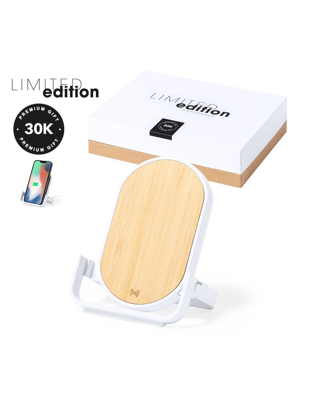 Distinguido Cargador Inalámbrico Limited Edition con función soporte para dispositivos móviles. Fabricado en bambú y carcasa en resistente ABS y caña de trigo. Con función carga rápida de 10W y compatible con dispositivos equipados con tecnología de carga inalámbrica. Incluye cable de carga de 100cm y manual de instrucciones en Español e Inglés. De la perfecta combinación entre exclusividad y diseño, nace Limited Edition, una colección especial de ideas promocionales de edidición limitada. Un nuevo concepto, inspirado en la fusión de artículos premium con las últimas y más novedosas tendencias y que cuenta con una seleción limitada de unidades, convirtiendo así un regalo en una experiencia única e inolvidable. Exclusivo estuche de presentación Limited Edition, con diseño protegido por derechos de propiedad industrial. Incluida tarjeta con descripción de Limited Edition en cartón reciclado.