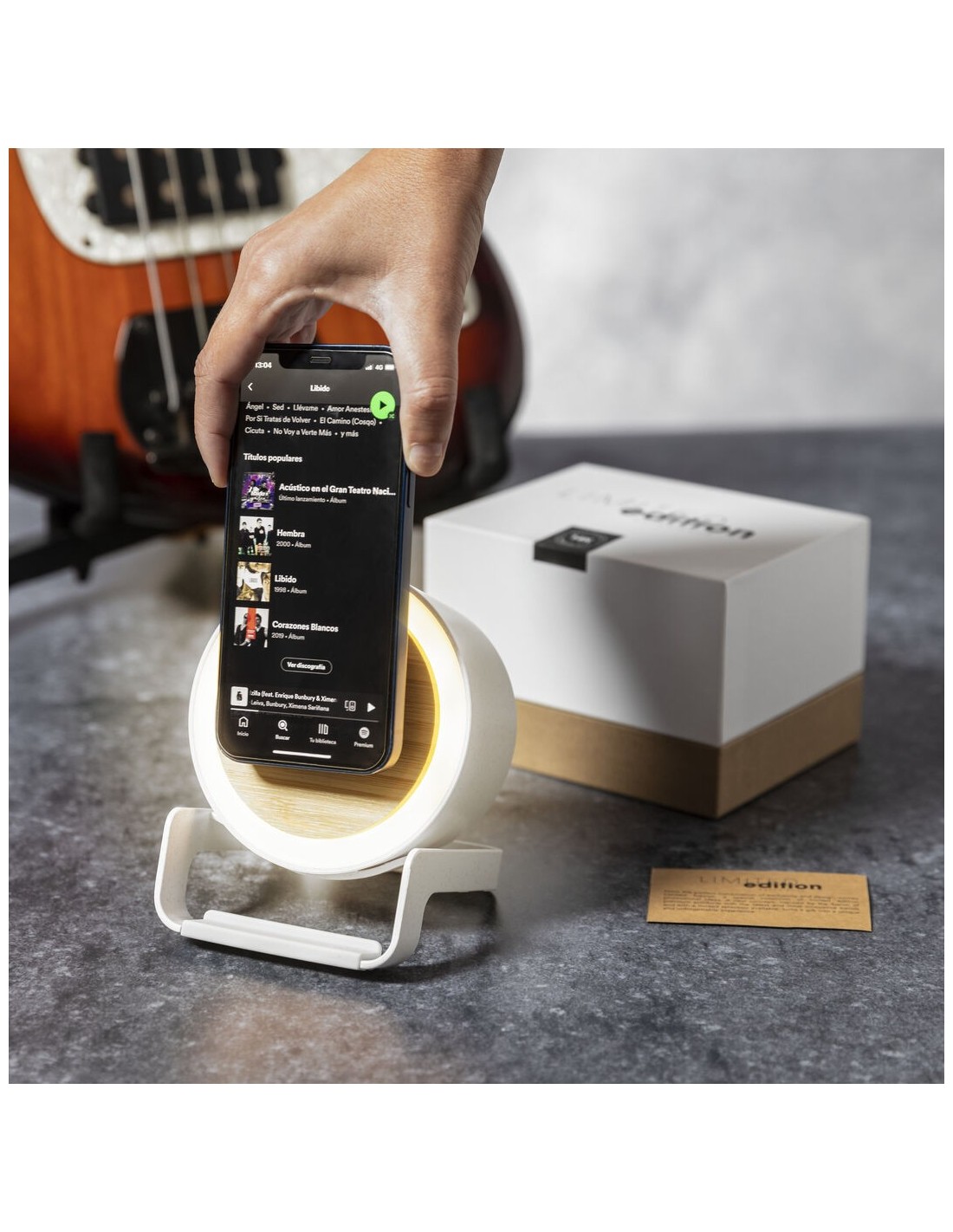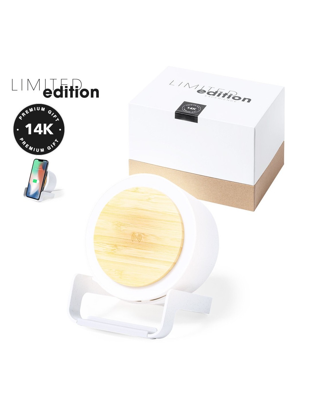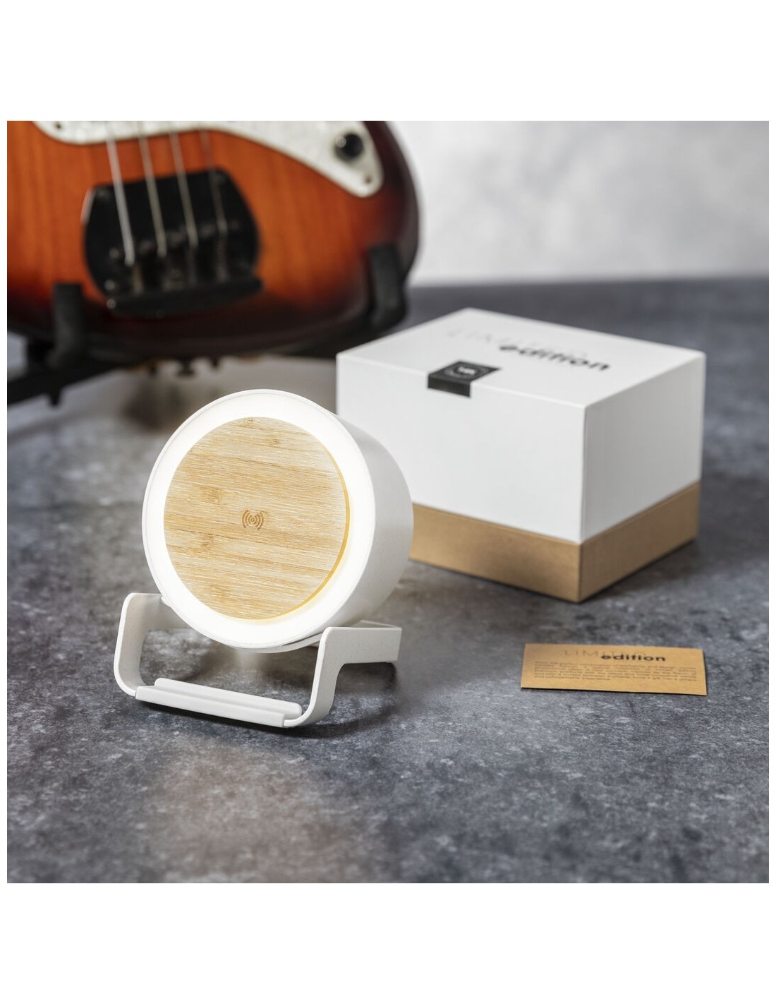 Lámpara multifunción Limited Edition con función altavoz, cargador inalámbrico y soporte para dispositivos móviles. Un moderno y sostenible diseño fabricado en bambú y carcasa en resistente ABS y caña de trigo, para así fomentar la utilización de materias primas naturales y reducir las emisiones contaminantes. Incluye función cargador inalámbrico 10W y lámpara de 12 ledes, con intensidad de luz regulable. Compatible con dispositivos móviles de carga inalámbrica, incluye cable cargador USB C de 100 cm. Altavoz Bluetooth con 3W de potencia. Disponible manual de instrucciones en Español e Inglés. De la perfecta combinación entre exclusividad y diseño, nace Limited Edition, una colección especial de ideas promocionales de edidición limitada. Un nuevo concepto, inspirado en la fusión de artículos premium con las últimas y más novedosas tendencias y que cuenta con una seleción limitada de unidades, convirtiendo así un regalo en una experiencia única e inolvidable. Exclusivo estuche de presentación Limited Edition, con diseño protegido por derechos de propiedad industrial. Incluida tarjeta con descripción de Limited Edition en cartón reciclado.