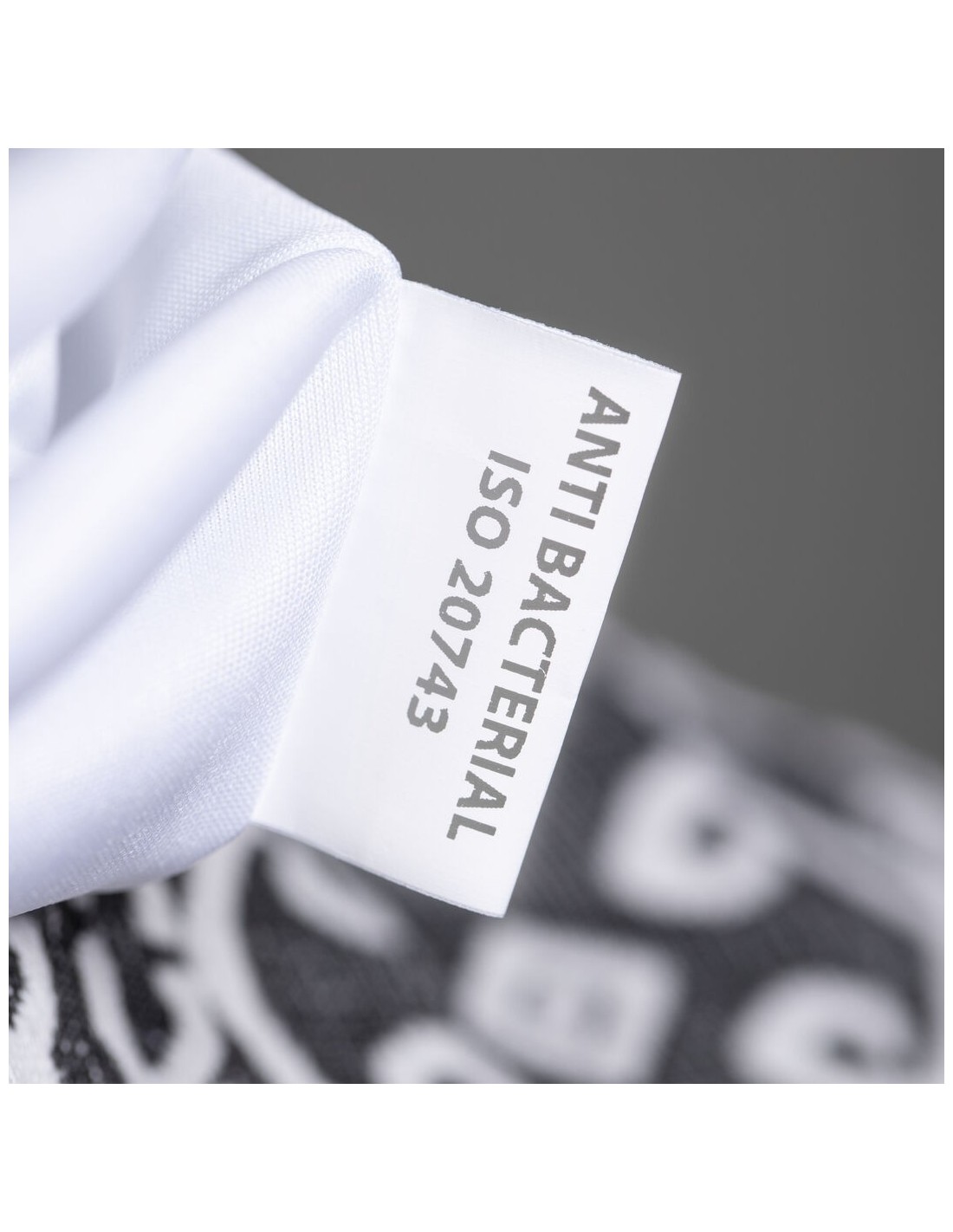 Braga antibacteriana de alta calidad en suave poliéster elástico con propiedades hidrófugas, fácil de imprimir. Con etiqueta distintiva antibacteriana. Los productos con tratamientos antibacterianos son capaces de reducir drásticamente las cargas bacterianas presentes en las superficies de los materiales, gracias a la incorporación de agentes microbianos permanentes estáticos, con alta efectividad para inhibir y prevenir la contaminación bacteriana. Artículo de acuerdo al estándar ISO 20743, que determina la actividad antibacteriana en productos textiles, lo que permite conocer la efectividad de inhibición microbiana que tienen los aditivos sobre los objetos tratados mediante una evaluación cuantitativa.