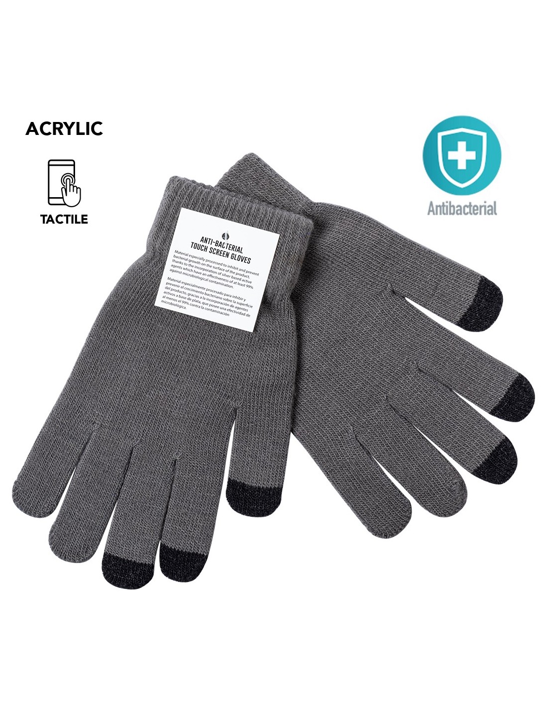 Par de guantes táctiles antibacterianos, diseñados para dispositivos con pantalla táctil. De cálido y suave acabalado acrílico, en combinación bicolor. Integran puntero en dedos corazón, índice y pulgar. Talla única para adulto. Presentados en bolsa individual. Los productos con tratamientos antibacterianos son capaces de reducir drásticamente las cargas bacterianas presentes en las superficies de los materiales, gracias a la incorporación de agentes microbianos permanentes estáticos, con alta efectividad para inhibir y prevenir la contaminación bacteriana. Artículo de acuerdo al estándar ISO 20743, que determina la actividad antibacteriana en productos textiles, lo que permite conocer la efectividad de inhibición microbiana que tienen los aditivos sobre los objetos tratados mediante una evaluación cuantitativa.