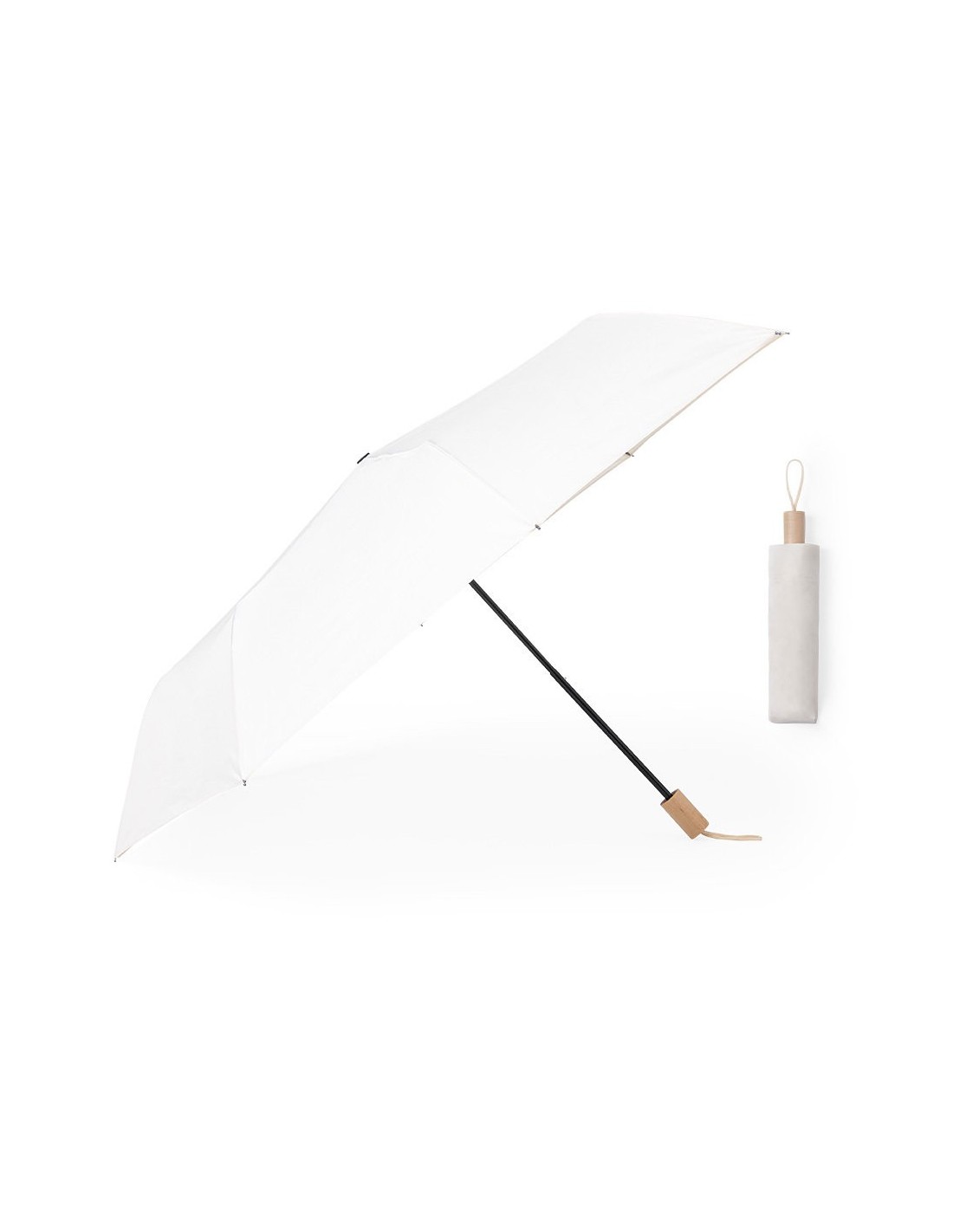Paraguas plegable de 8 paneles y 106 cm de diámetro, en resistente material pongee 190T de acabado natural. De apertura manual, con varillas metálicas en negro y tira con cierre de velctro. Mango de madera con cordón a juego y funda en mismo material.