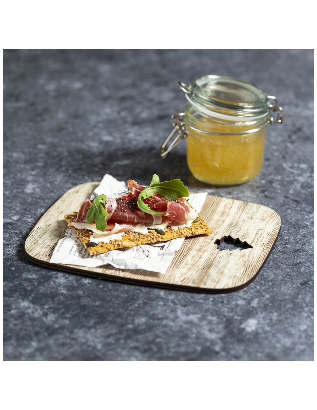 Tabla rectangular de corte y presentación con troquelado de árbol de navidad. Fabricada en madera natural y de original acabado bicolor. Amplia superficie de marcaje y distintivo Made In Europe.
