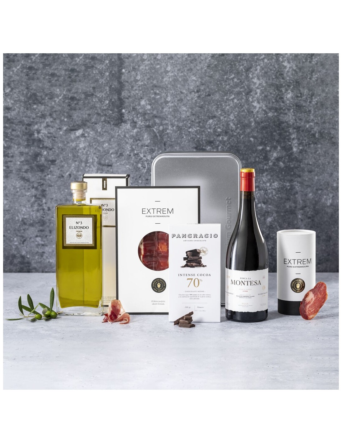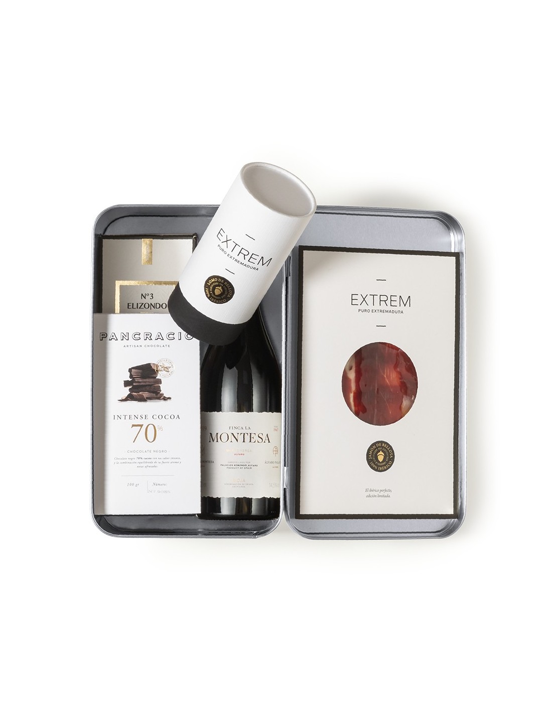 Set premium gourmet: delicioso, con un diseño perfecto para regalar y causar sensación. Una selección premium, para los paladares más exquisitos, acompañado de un packaging único que apuesta por el diseño. Incluye:Vino tinto LA MONTESA “Álvaro Palacios” con DOCa Rioja, en botella de 750 ml. Un tinto radiante, de textura sedosa y buena guarda. Galardonado con con multitud de premios, destacando los 93 puntos Parker y la medalla de oro en los Premios Bacchus 2022.Jamón de bellota 100% ibérico EXTREM en sobre de 80g, de la Dehesa de Extremadura y cortado a mano.Lomo de bellota 100% Ibérico EXTREM en canister de 250g.Chocolate negro. 70% Intense Cocoa PANCRACIO, en tableta de 100g. Para los amantes del chocolate más puro, sorprendente por su intenso sabor y sus delicadas notas afrutadas.Aceite Virgen Extra ELIZONDO en botella de 500 ml. Extra temprano y de variedad Picual, de un color verde intenso, recolectado en las primeras semanas de octubre, cuando las características organolépticas del fruto son óptimas, de extracción en frío. Pesentado en botella de cristal de diseño con tapón de seguridad.Set presentado en caja metálica Premium Gourmet de sobrio diseño, protegido con estuche individual en cartón blanco con distintivo Premium Gourmet.