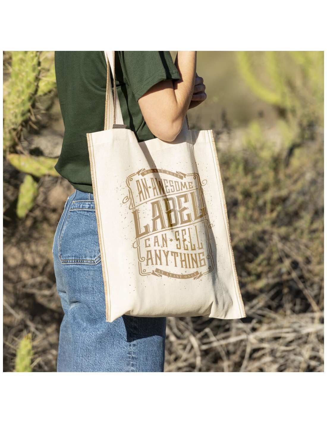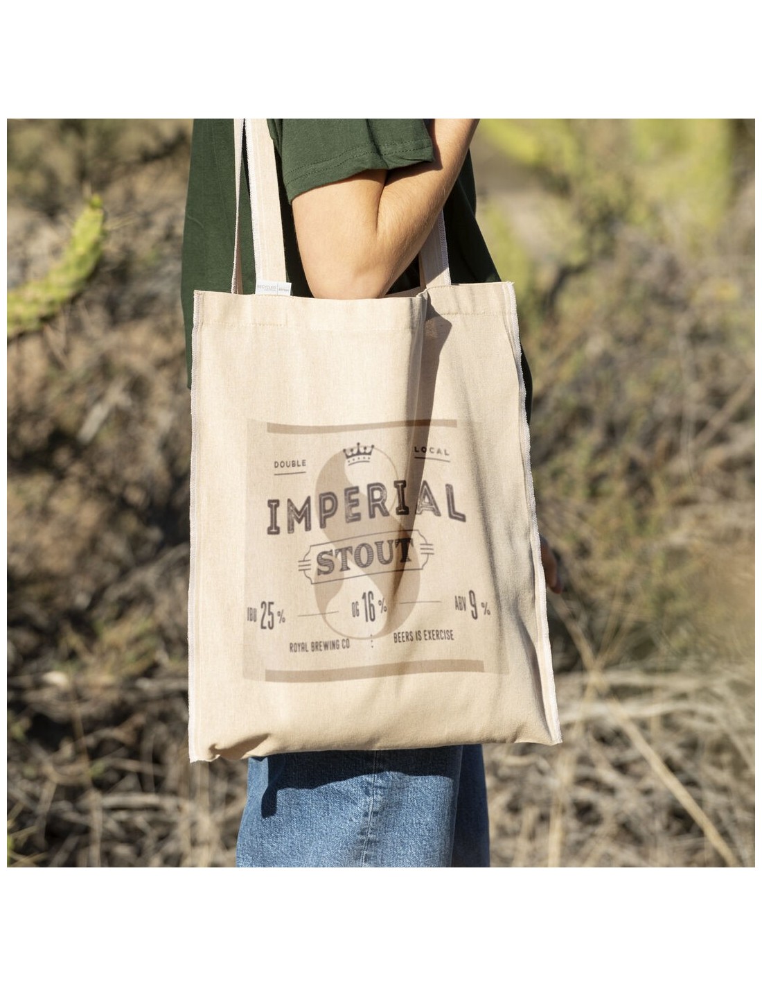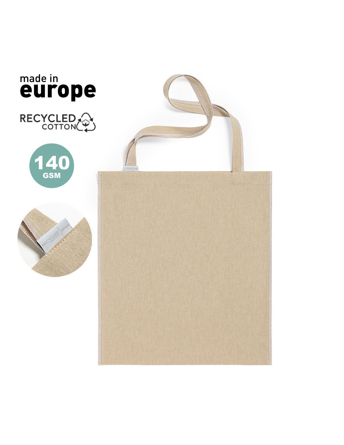 Bolsa en resistente material 100% algodón reciclado GRS de 140g/m2, con acabado en color tierra y terminación con costura exterior visible en color a contraste, a juego con etiqueta distintiva. De asas largas de 70cm y acabado cosido. Resistencia hasta 9kg de peso. Certificación GRS (Global Recycled Standard / Estándar de Reciclaje Global), que garantiza el origen reciclado del material usado para fabricar el producto.