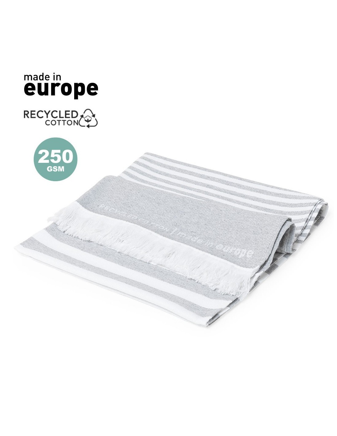 Pareo toalla 2 en 1 de línea nature y acabado gris. De fabricación europea y en combinación de algodón reciclado y poliéster de 250g/m2. Con certificación GRS (Global Recycled Standard / Estándar de Reciclaje Global) que acredita el origen reciclado del material usado en la fabricación del producto. Tamaño 150 x 80 cm.