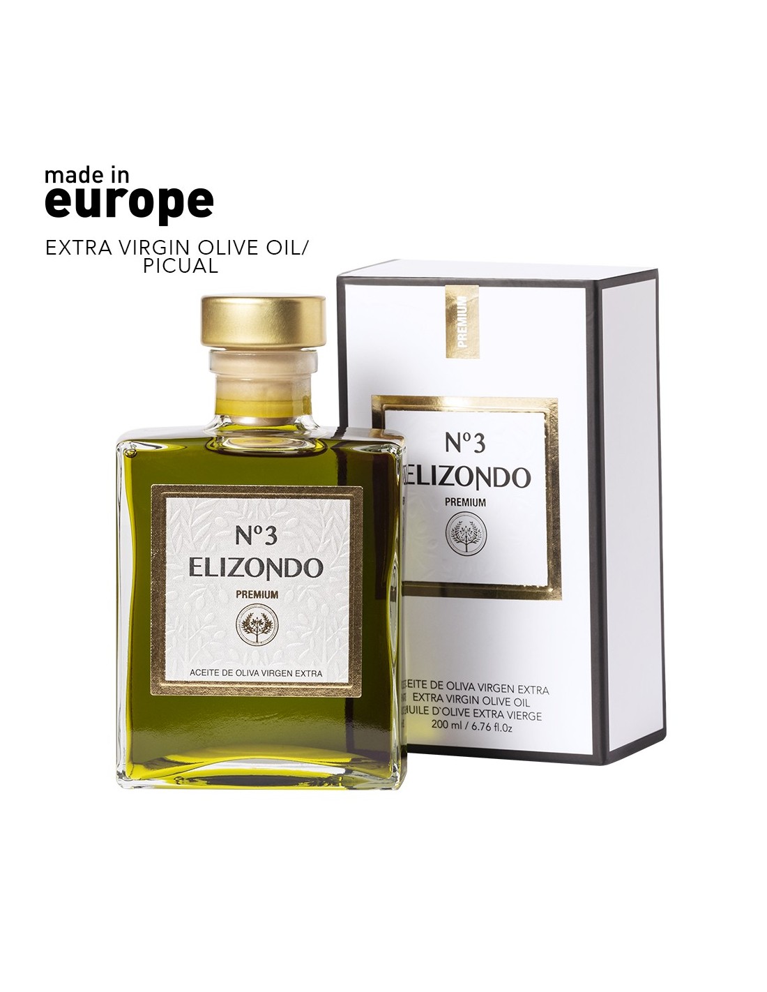 Aceite de oliva Elizondo Nº3 200ml. Calidad Virgen Extra temprano y de variedad Picual, de un color verde intenso, recolectado en las primeras semanas de octubre, cuando las características organolépticas del fruto son óptimas, de extracción en frío. Fabricación española y presentado en botella de cristal de diseño con tapón de seguridad. Caja individual exclusiva con amplia superficie de marcaje.