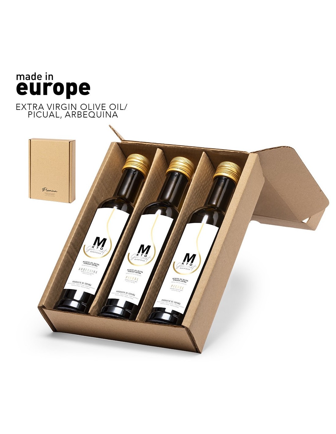 Set de aceite Premium Golden en 3 botellas de cristal de 250 ml, de calidad Virgen Extra y en variedades 2xPicual y 1xArbequina. Aceites de gran intensidad, cuyo fruto se recolecta de forma temprana, garantizando así las mejores propiedades organolépticas, y extracción en frio. Fabricación española, presentado en un elegante estuche de cartón kraft, con amplia superficie de marcaje.