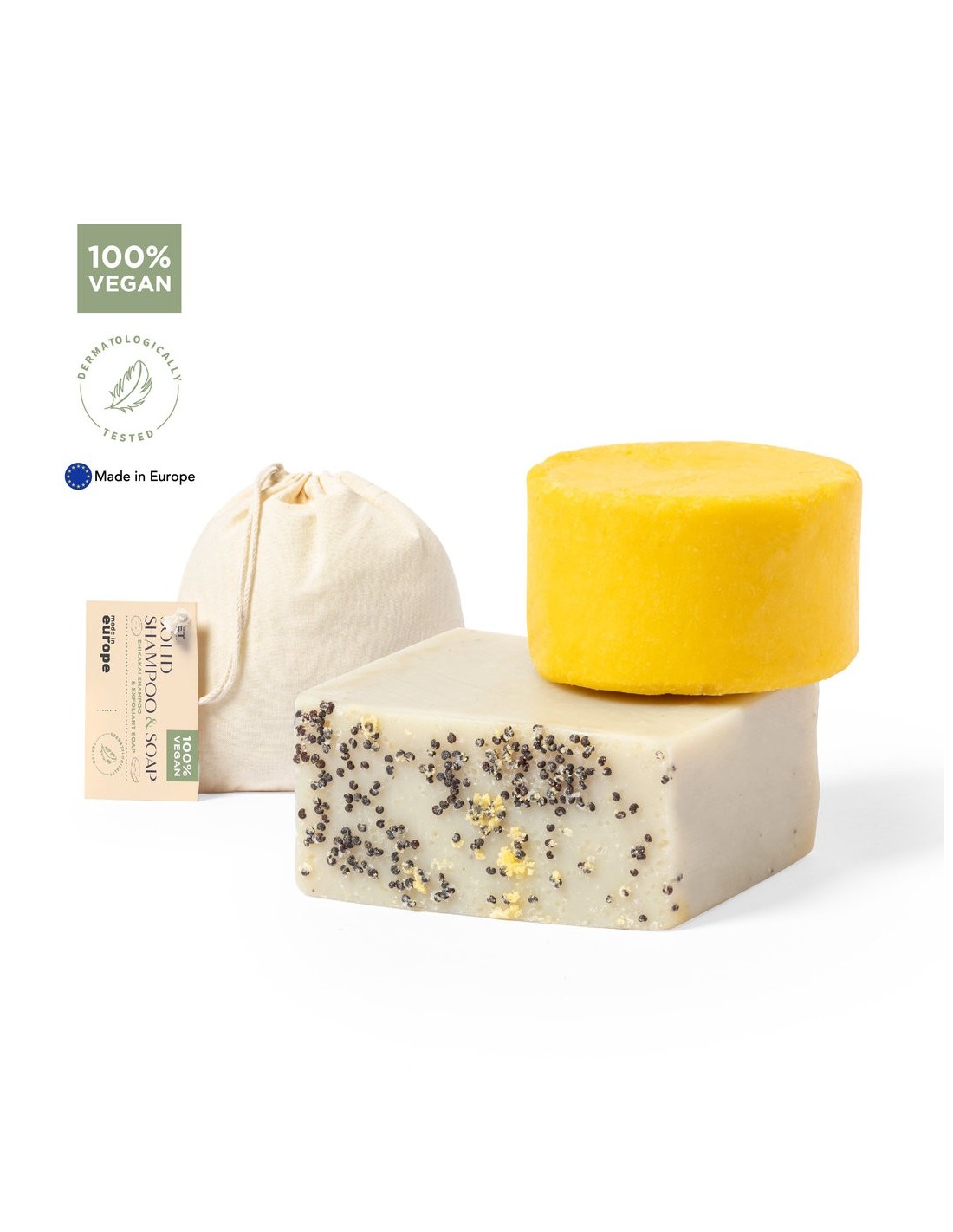 Set vegano de jabón y champú sólidos. Contenido: Pastilla de jabón botánico de 50 gr, elaborada con ingredientes de cultivo ecológico. Con propiedades reguladoras y purificantes. Champú sólido Shikakai de 30 gr, elaborado con una selección de ingredientes activos como la oliva virgen, manteca de karité bio, zanahoria y extractos botánicos de shikakai. Rico en vitamina E, aportando al cabello limpieza, sedosidad y vigor. De agradable fragancia que aporta un estado de placer y bienestar interior. Presentación en bolsa individual de algodón, con cierre de cordón y etiqueta distintiva. Dermatológicamente testado y de fabricación europea. Producto sostenible y 100% vegano, sin ingredientes de procedencia animal. Además, no se han realizado pruebas de estos productos en animales, promoviendo el cuidado y respeto de todos ellos.