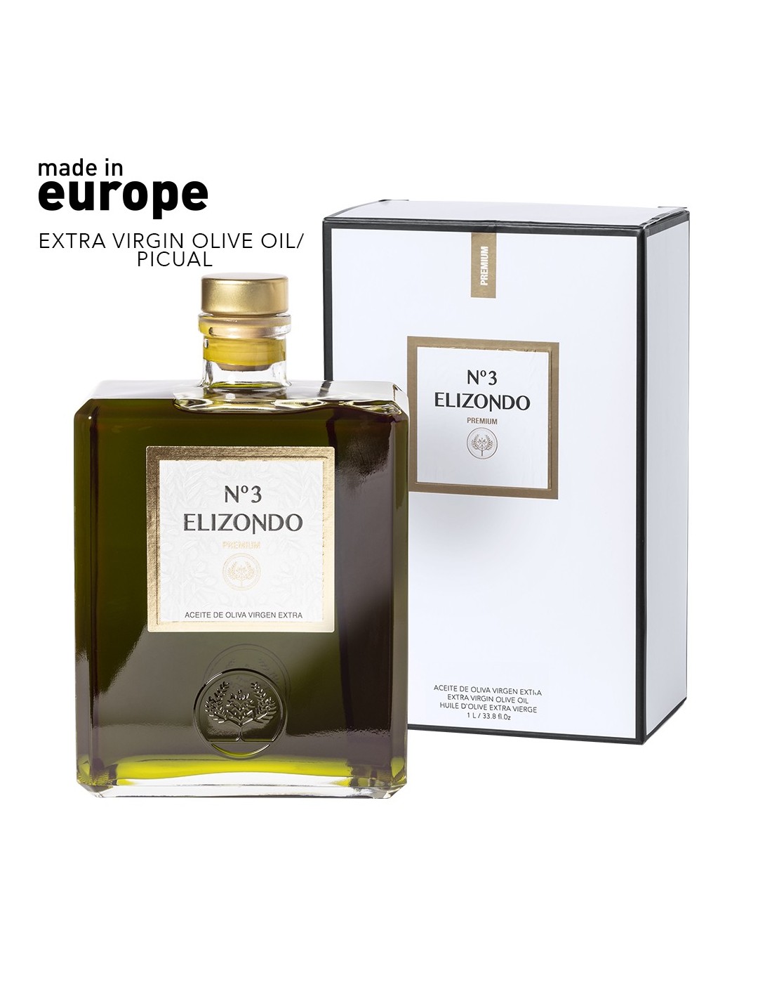 Aceite de oliva Elizondo Nº3 1L. Calidad Virgen Extra temprano y de variedad Picual, de un color verde intenso, recolectado en las primeras semanas de octubre, cuando las características organolépticas del fruto son óptimas, de extracción en frío. Fabricación española y presentado en botella de cristal de diseño con tapón de seguridad. Caja individual exclusiva con amplia superficie de marcaje.