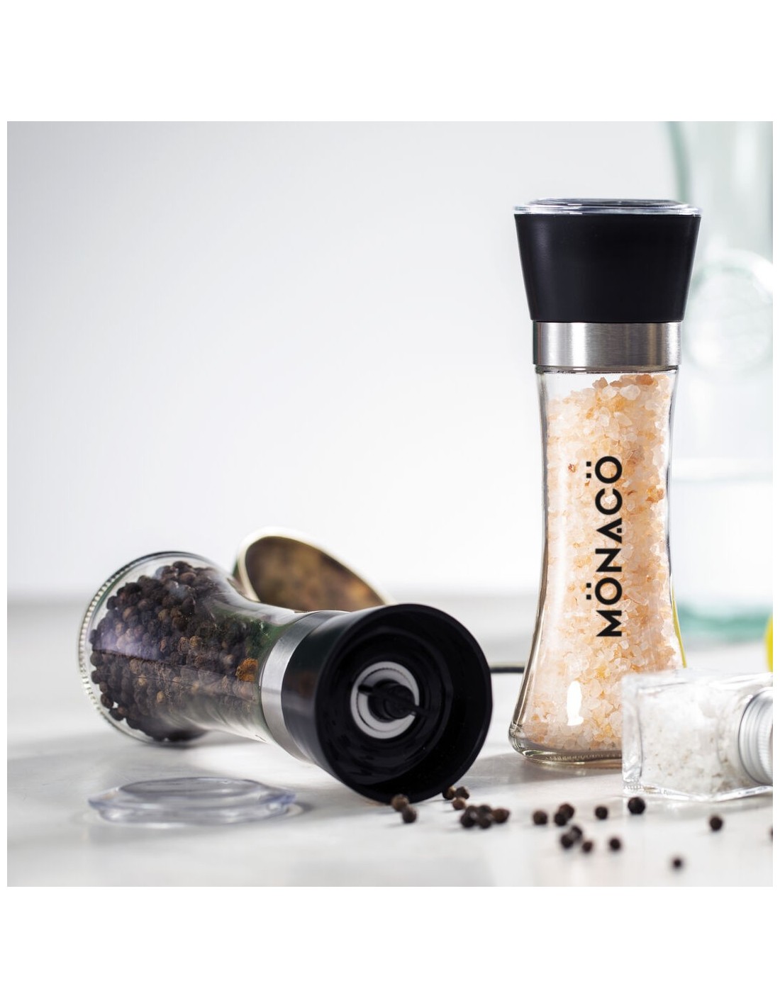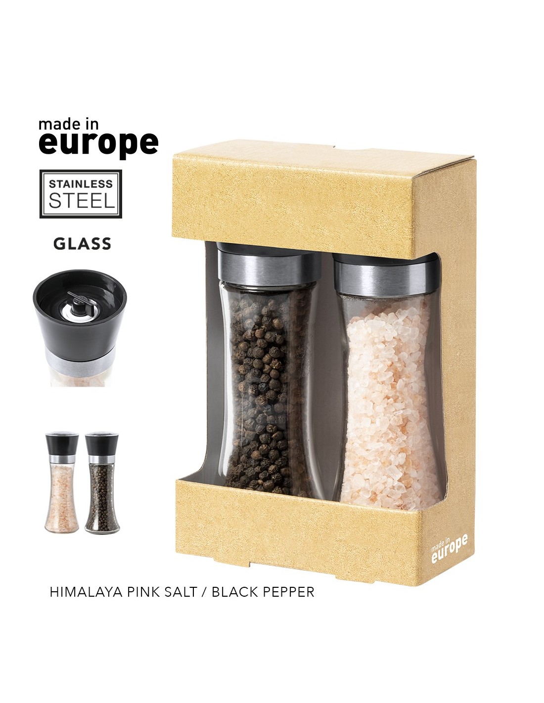 Set de 2 molinillos, con sal rosa del Himalaya y de pimienta negra. De fabricación europea, hechos en cristal y acero inoxidable. Con mecanismo de molienda regulable y recipientes rellenables. Set presentado en estuche de cartón con ventana.