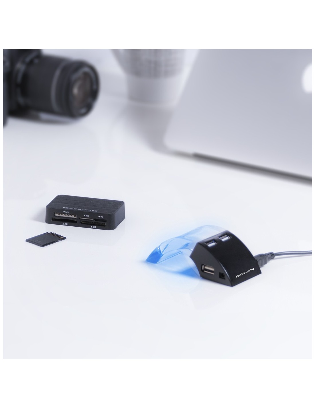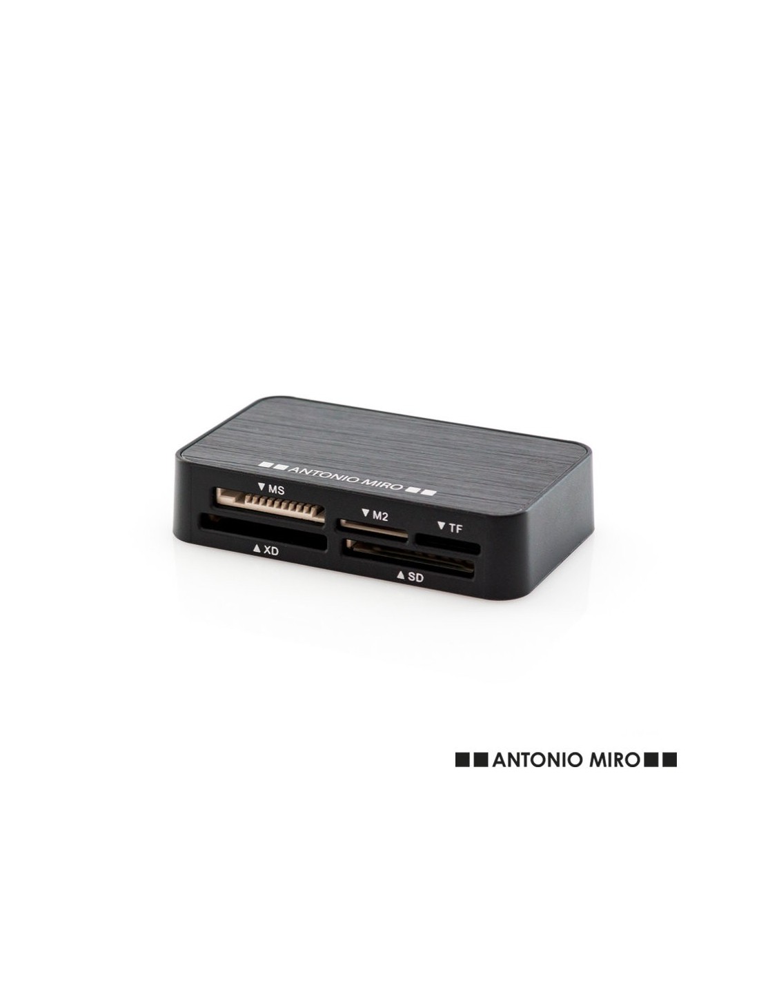 Lector de tarjetas de Antonio Miró con parte superior acabada en aluminio de elegante color negro. Compatible con tarjetas MS, M2, TF, XD, SD y CF. Presentado en caja individual con logotipo de la marca e interior troquelado en suave espuma.