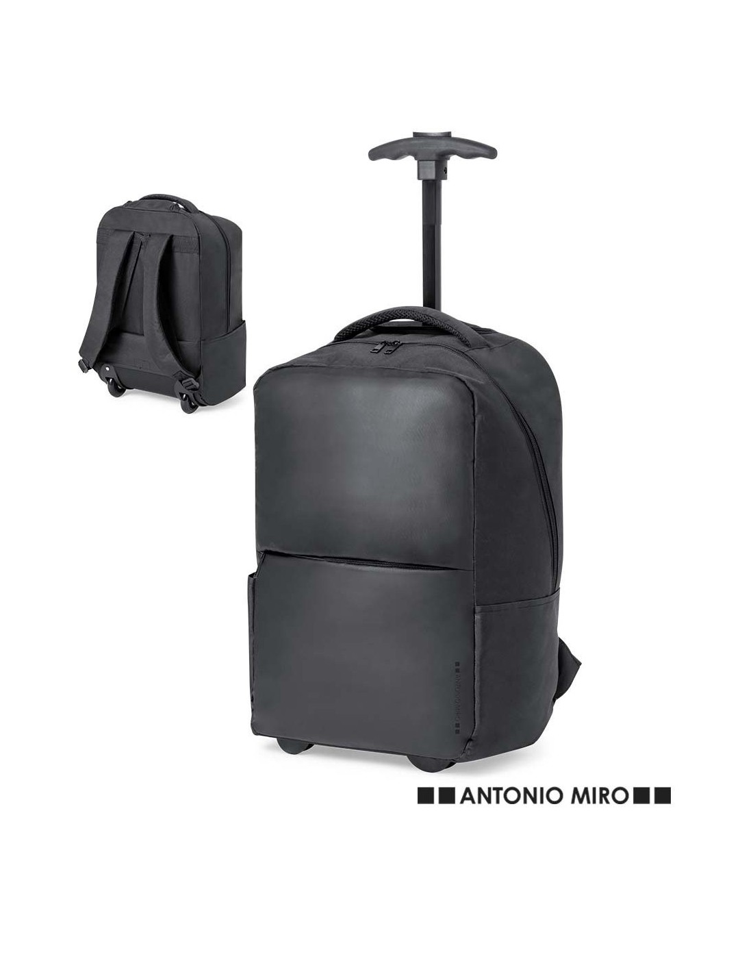Mochila trolley de Antonio Miró, fabricada en resistente poliéster 300D con acabados en negro. Compartimento principal y bolsillo exterior con cierre de cremallera a juego, asa de transporte acolchada y bolsillos laterales; con logotipo de la marca en un lado. Compartimento interior acolchado para ordenador portátil de hasta 15 pulgadas y bolsillo para tablet de hasta 11 pulgadas. Cintas para hombros acolchadas y ajustables.