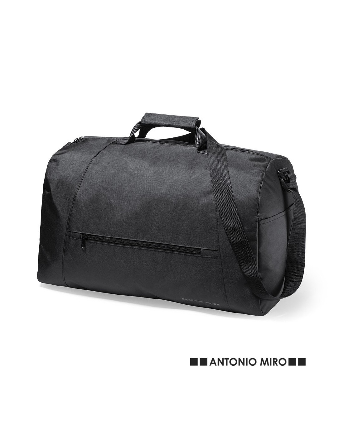 Bolso de Antonio Miró, fabricado en resistente poliéster 300D con acabados en negro. Compartimento principal y bolsillos exteriores con cierre de cremallera a juego; asas de transporte con velcro y bolsillos laterales. Con logotipo de la marca en la base y cinta bandolera ajustable.