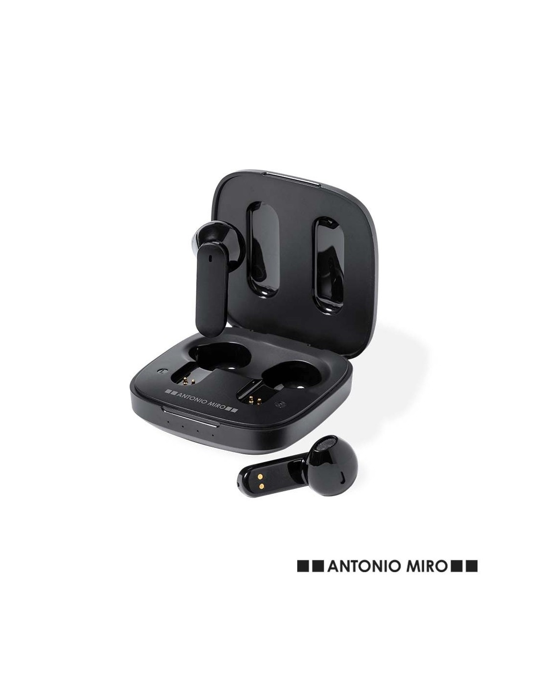Auriculares intraurales Bluetooth de Antonio Miró, de diseño y en elegante acabado negro mate. Conexión Bluetooth® 5.0, con batería integrada de litio de 30 mAh en cada auricular. Diseño ergonómico, con botón de control táctil en el auricular y función manos libres. Base de carga a juego con logotipo de la marca, de 300 mAh de capacidad y con indicador LED de estado de carga. Cable de carga Tipo C a juego incluido y presentados en caja individual negra con logotipo Antonio Miró. Disponible manual de instrucciones en español e inglés.