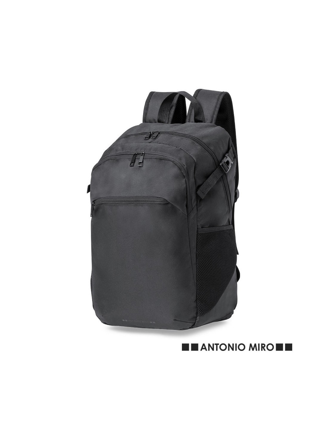 Mochila de Antonio Miró, fabricada en resistente poliéster 300D con acabados en negro. Compartimento principal y bolsillos exteriores con cierre de cremallera a juego; asa de transporte y bolsillos laterales. Cintas de ajuste laterales con cierre de hebilla y logotipo de la marca en la base. Compartimentos interiores acolchados para ordenador portátil de hasta 17 pulgadas y tablet de hasta 10 pulgadas. Parte trasera acolchada y cintas para hombros ajustables y acolchadas; con accesorio de ajuste en la parte trasera para barra de trolley.