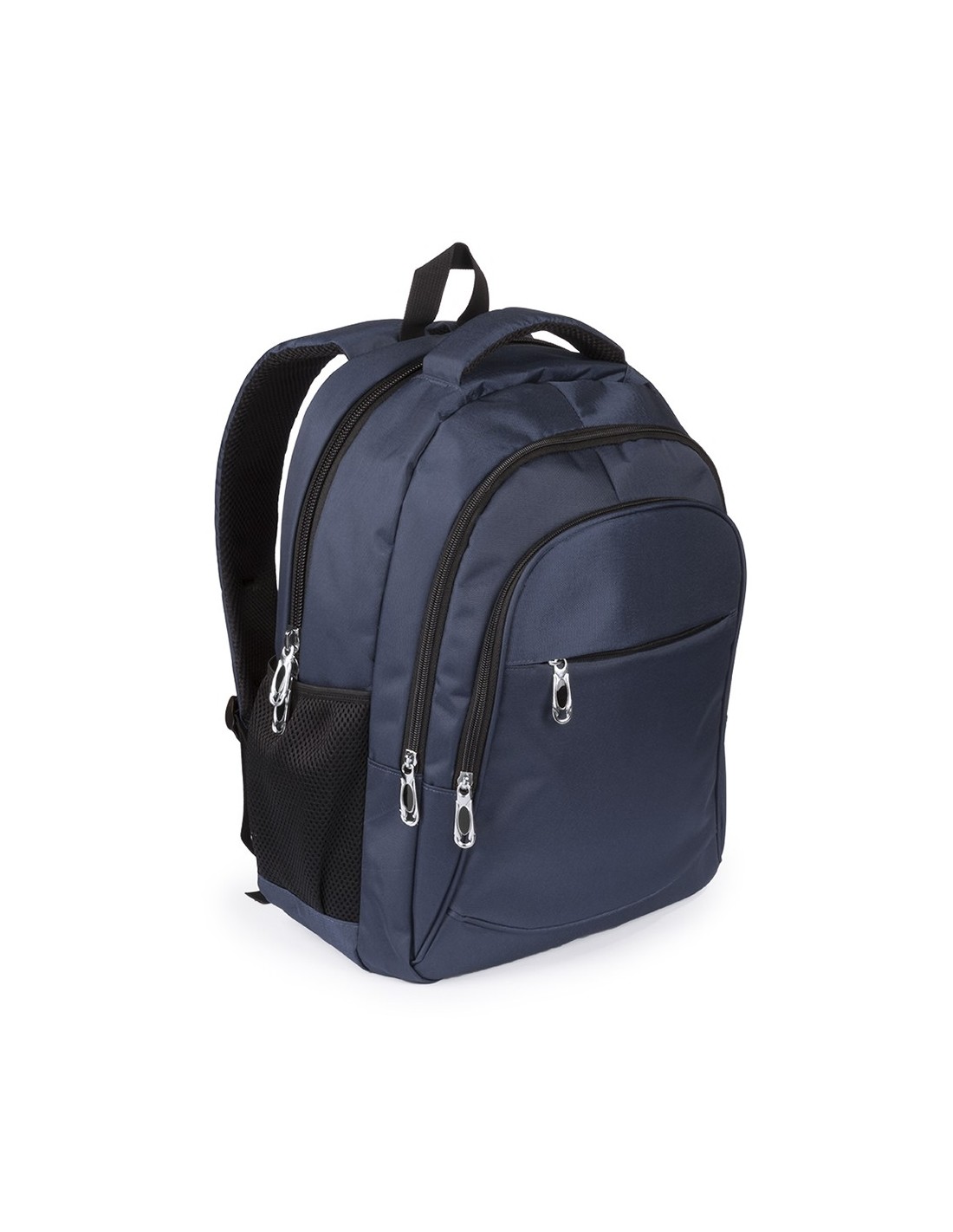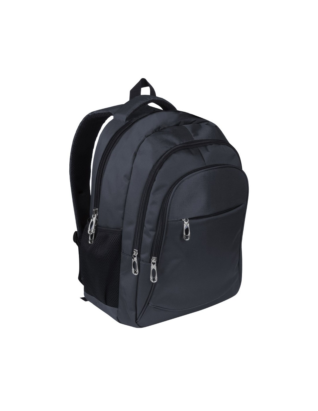 Mochila de resistente nylon 600D de sobrio diseño con cierre de cremallera, bolsillos frontales y asa reforzada doble. Con acolchado ergonómico en espalda y cintas de hombros, incluye compartimento interior acolchado para ordenador portátil de hasta 15.