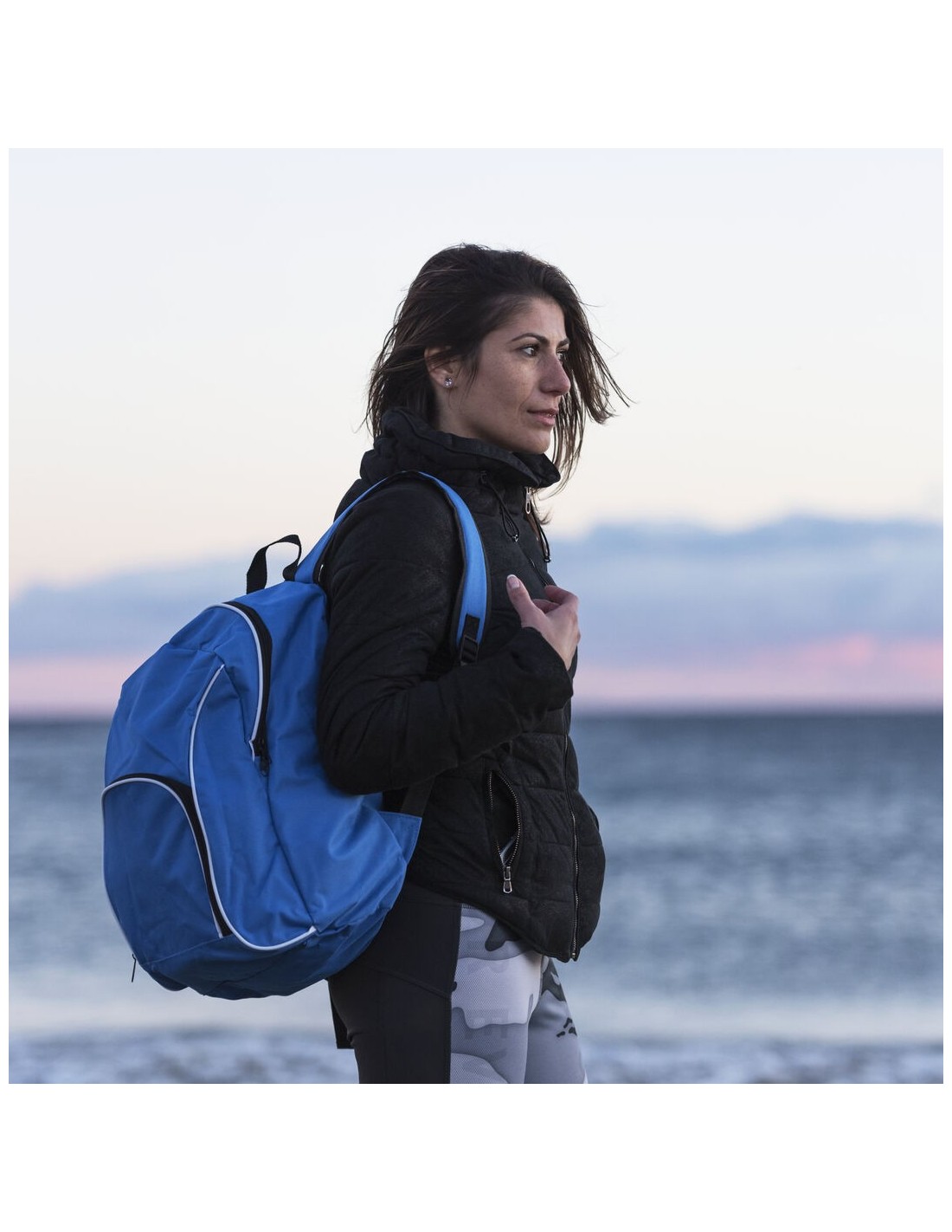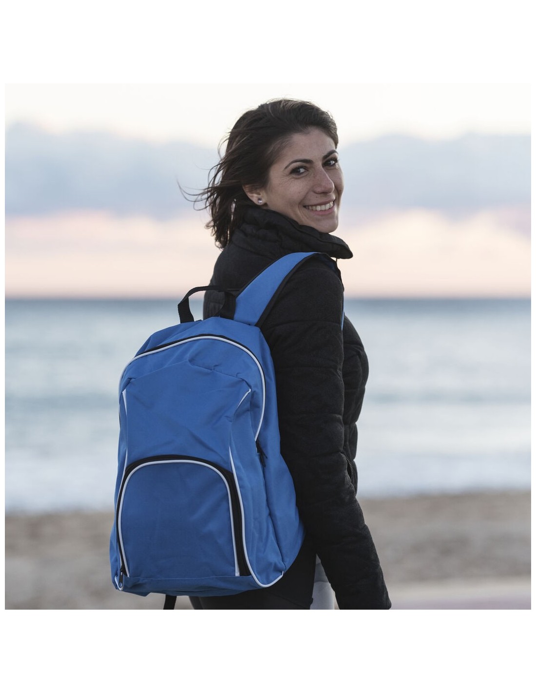 Mochila en resistente poliéster 600D de desenfadado diseño en variada gama de colores y con ribete de refuerzo en color blanco. Con cierre de cremallera de doble tirador, bolsillo frontal y bolsillos de redecilla elástica en los lados. Esquinas reforzadas