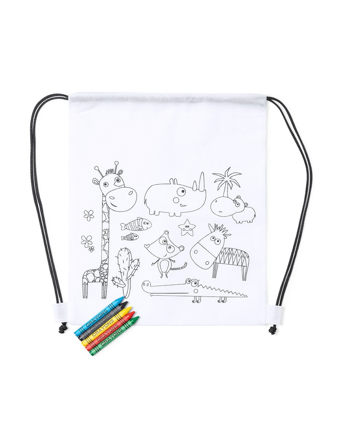 Mochila de non-woven en color blanco especialmente diseñada para colorear con ceras. Incluye 5 ceras de cuerpo cilíndrico en variados colores. Con cuerdas autocierre en color negro y refuerzo en las esquinas.
