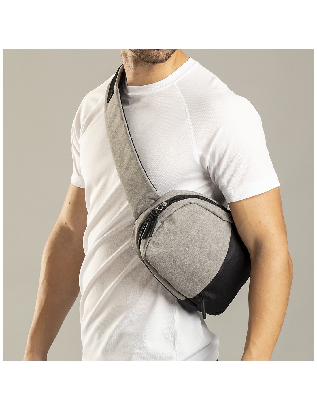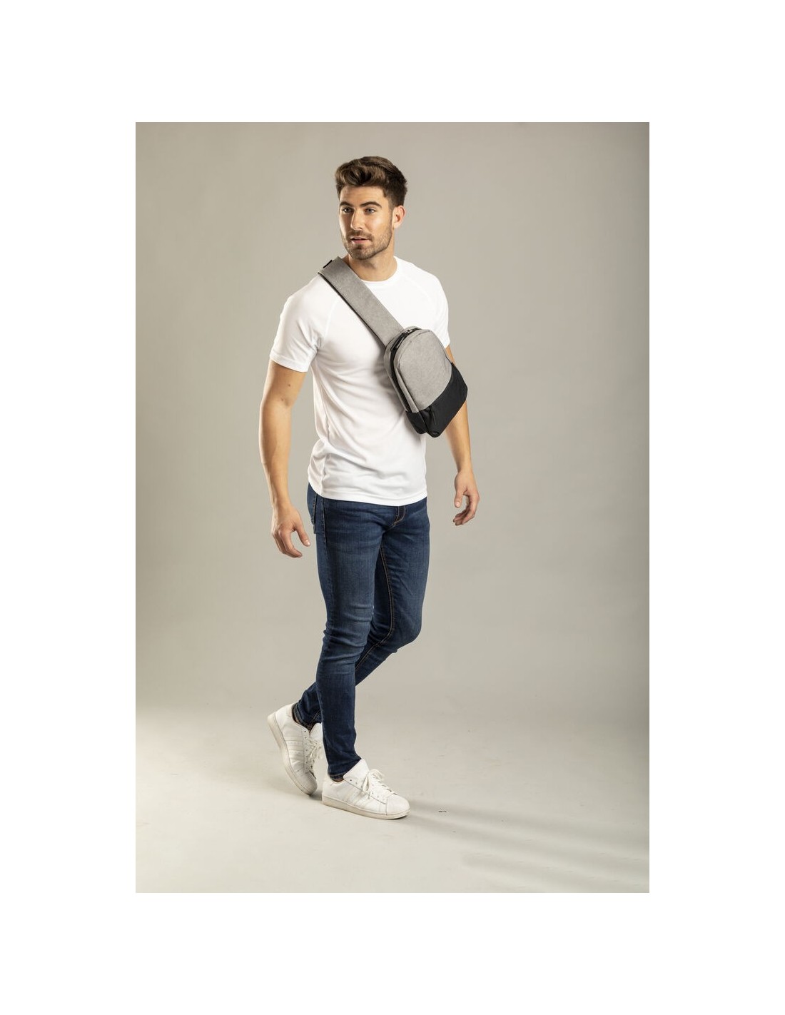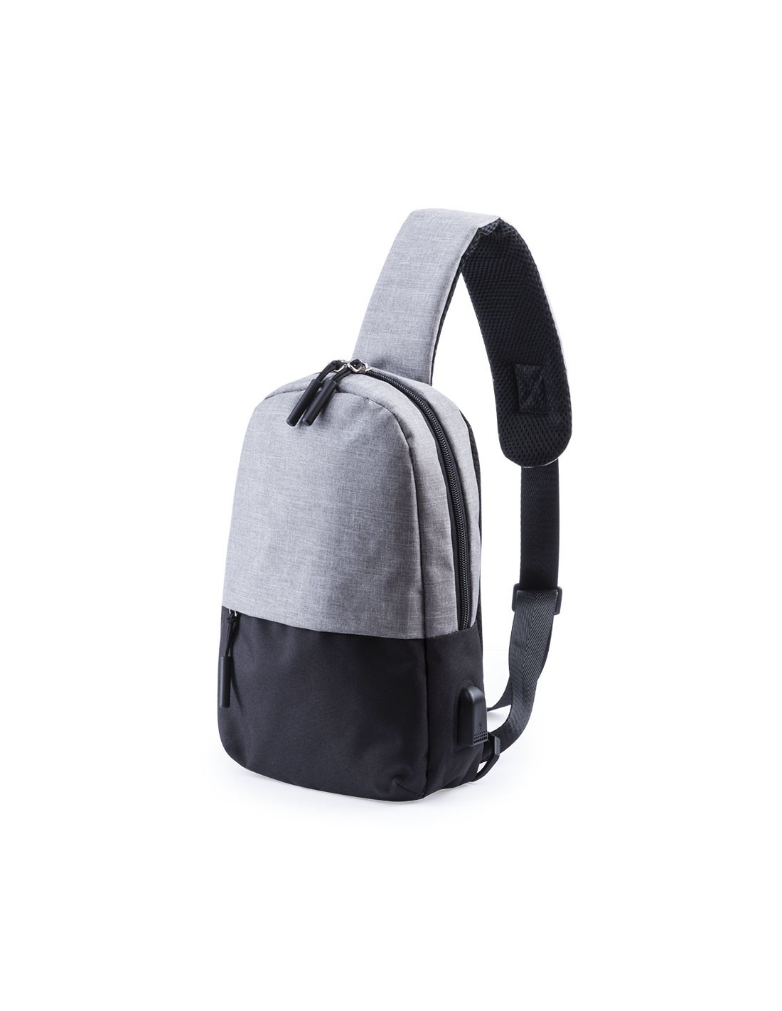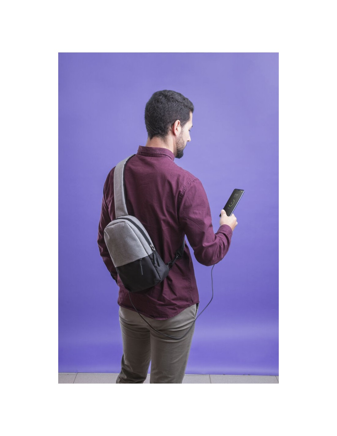Bandolera multiusos en resistente poliéster 300D. De atractivo diseño urbano, en combinación de colores gris denim y negro. Con conexión USB para carga -powerbank y cable no incluídos- y bolsillo acolchado para tablet de hasta 10 pulgadas. Espalda y cinta acolchadas, con cinta de ajuste regulable. Bolsillo principal de fácil apertura, con cierre de cremallera y resistentes tiradores.