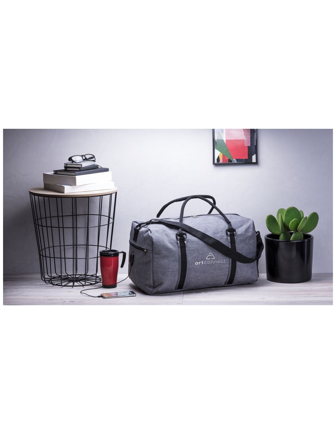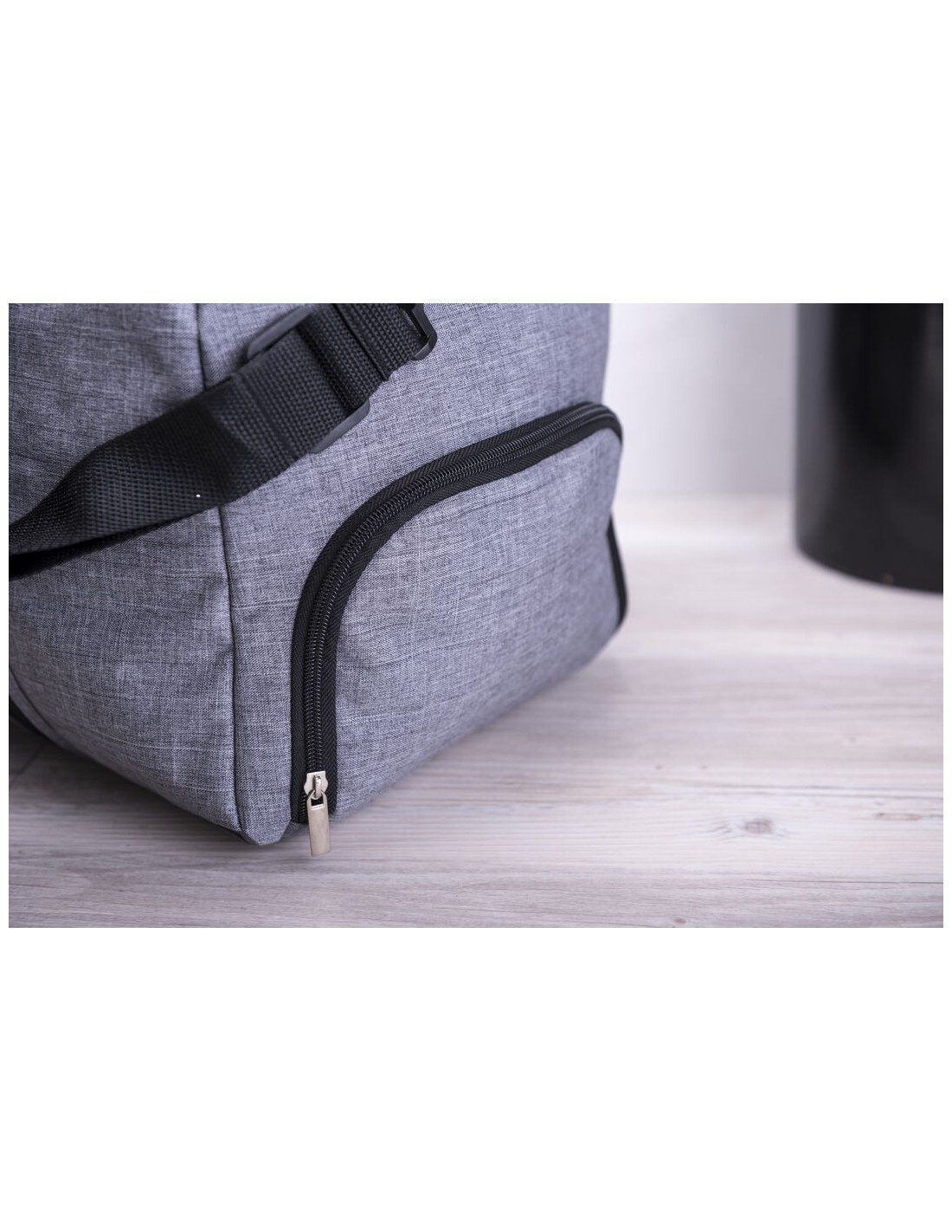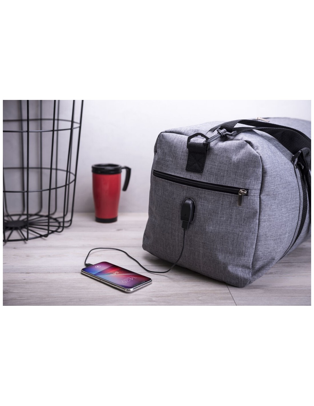 Bolso multiusos en resistente poliéster 600D de acabado denim. Con conexión USB -cable y power bank non incluidos-, compartimento independiente de cierre de cremallera para el calzado y bolsillo lateral de cremallera. Compartimento principal con cierre de cremallera de doble tirador y asas de transporte reforzadas con acolchado. Refuerzo de nylon alrededor del cuerpo y cinta bandolera ajustable de doble cierre de mosquetón.
