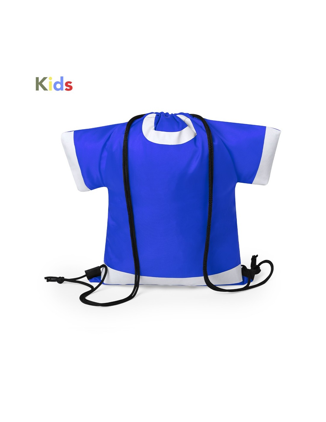 Original y divertida mochila de cuerdas para niños en forma de camiseta. En suave poliéster 210D, con cuerdas autocierre en color negro y esquinas reforzadas. disponible en variada gama de colores intensos.
