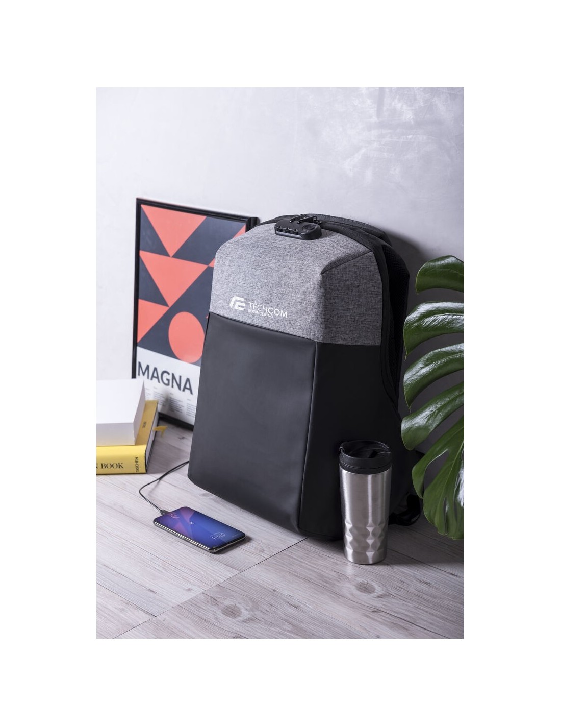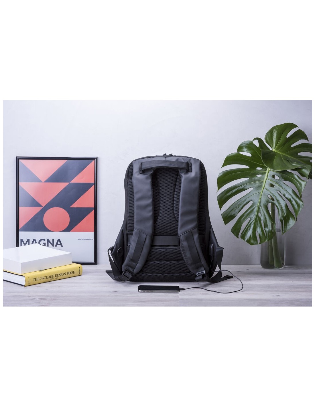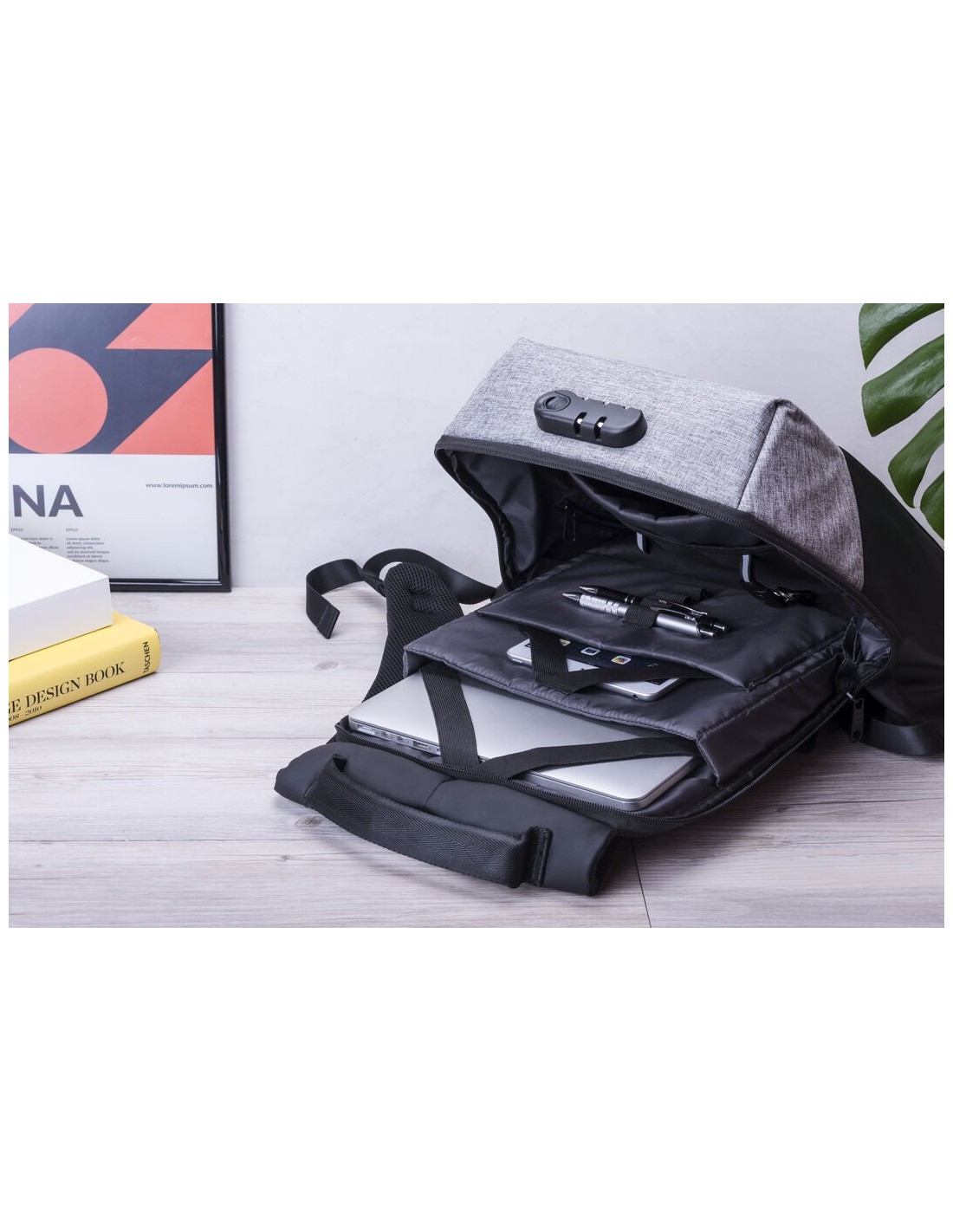 Mochila de negocios antirrobo repelente al agua en poliéster de alta calidad, resistente a cortes y a roces. Con candado de seguridad por contraseña, cinta reflectante trasera y accesorio para acople en trolley. Bolsillo antirrobo en la espalda para guardar objetos de valor. Compartimento interior con salida USB para conexión de powerbank -no incluido-, con cable micro USB de 1 metro de largo para total comodidad en la carga de cualquier dispositivo móvil. Salida para auriculares y bolsillo en cinta derecha con fácil acceso para tarjeta de transporte y otros documents de uso frecuente. Apertura total 180º para fácil acceso al interior de la mochila. Dos compartimento interiores independientes y acolchados para ordenador portátil de hasta 15 pulgadas y para tablets de hasta 10 pulgadas. Con multitud de bolsillos interiores y exteriores. Cintas de hombros y espalda con acolchado ergonómico.