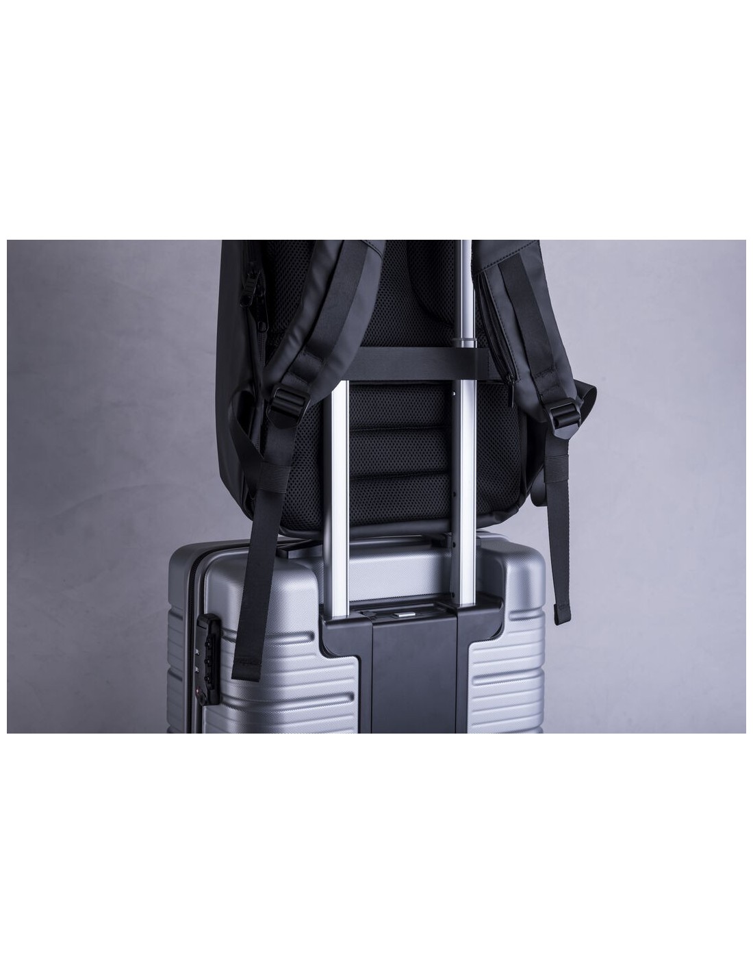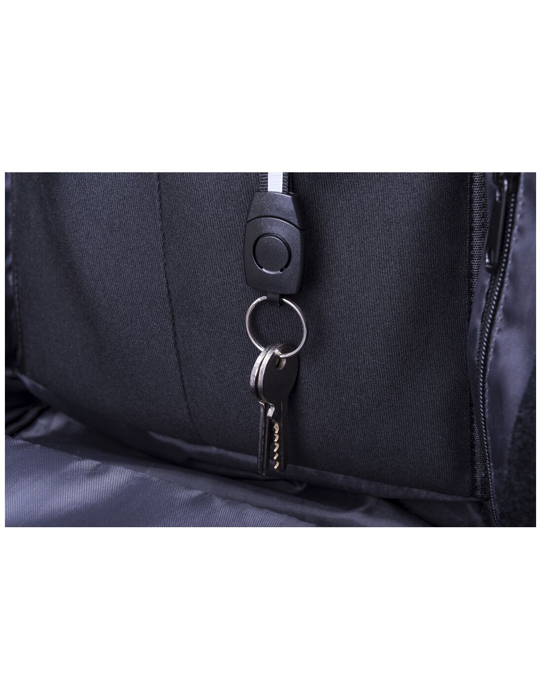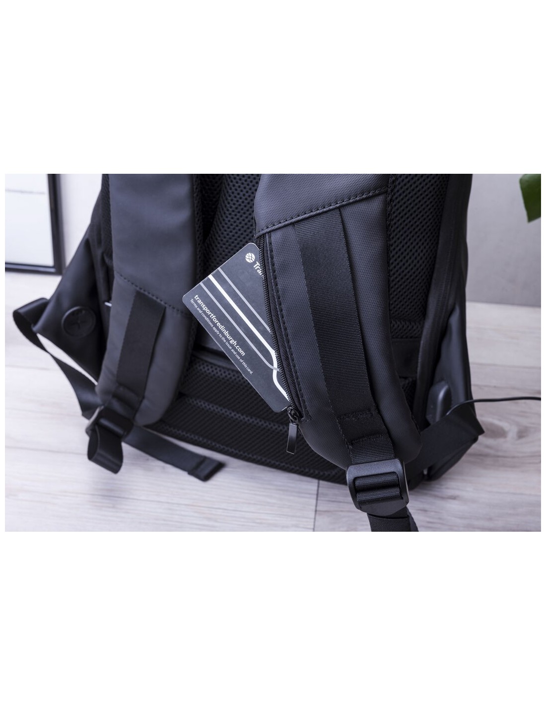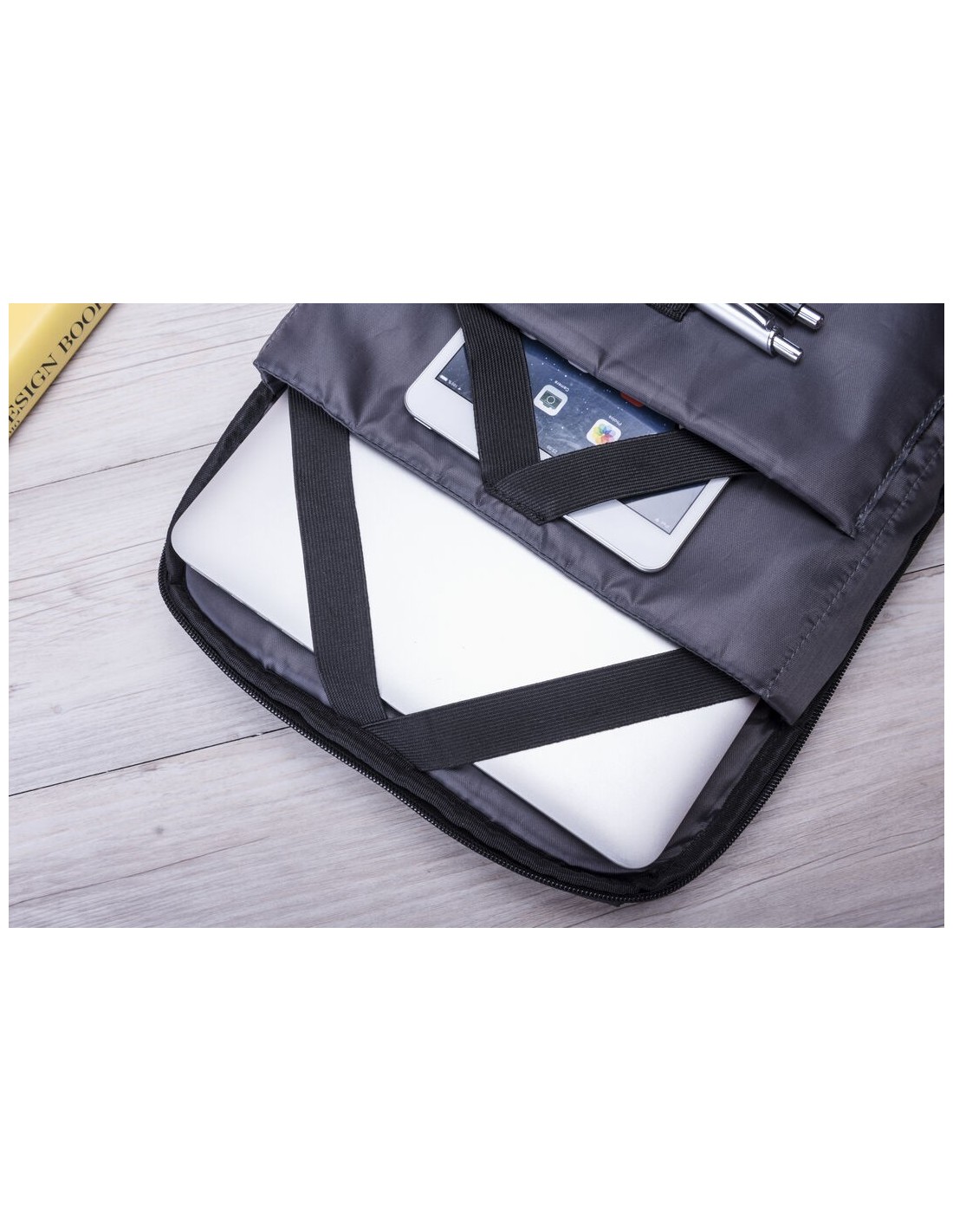 Mochila de negocios antirrobo repelente al agua en poliéster de alta calidad, resistente a cortes y a roces. Con candado de seguridad por contraseña, cinta reflectante trasera y accesorio para acople en trolley. Bolsillo antirrobo en la espalda para guardar objetos de valor. Compartimento interior con salida USB para conexión de powerbank -no incluido-, con cable micro USB de 1 metro de largo para total comodidad en la carga de cualquier dispositivo móvil. Salida para auriculares y bolsillo en cinta derecha con fácil acceso para tarjeta de transporte y otros documents de uso frecuente. Apertura total 180º para fácil acceso al interior de la mochila. Dos compartimento interiores independientes y acolchados para ordenador portátil de hasta 15 pulgadas y para tablets de hasta 10 pulgadas. Con multitud de bolsillos interiores y exteriores. Cintas de hombros y espalda con acolchado ergonómico.