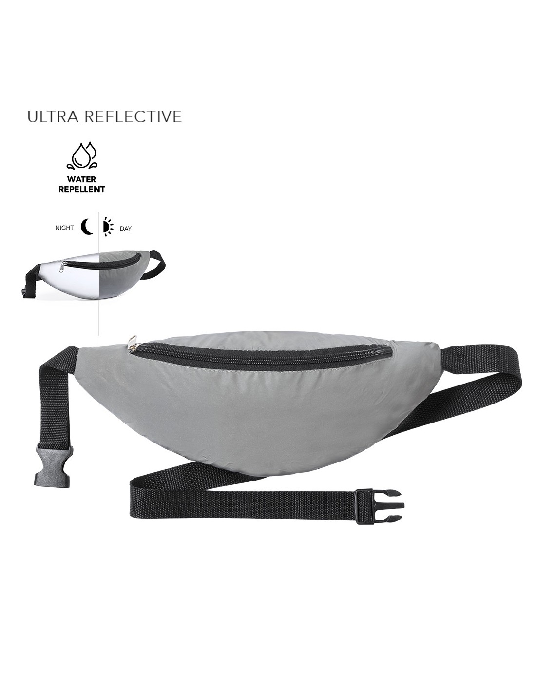 Riñonera en resistente poliéster 210T. Fabricada empleando tejido con gran capacidad para reflejar intensamente la luz, gracias a millones de pigmentos reflectantes y basándose en el principio de la retro-reflexión de la luz, una propiedad de visibilidad nocturna que consiste en la refracción de la luz hacia la fuente de origen de la misma. Con bolsillo de cierre de cremallera y cinta con cierre de hebilla ajustable. Diseñada para el día a día y actividades de ocio. Resistente al agua.