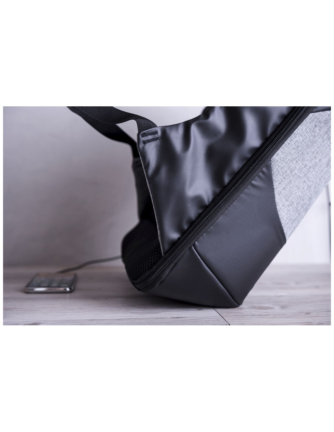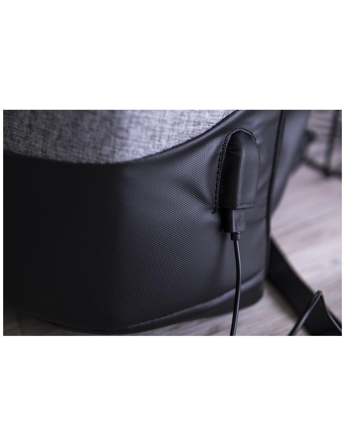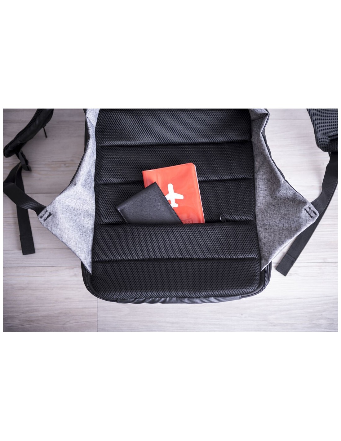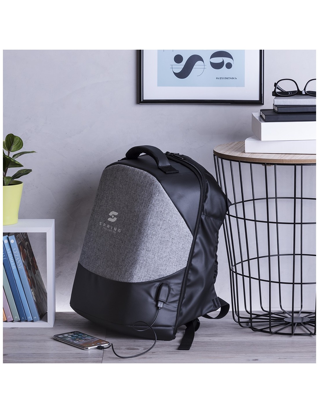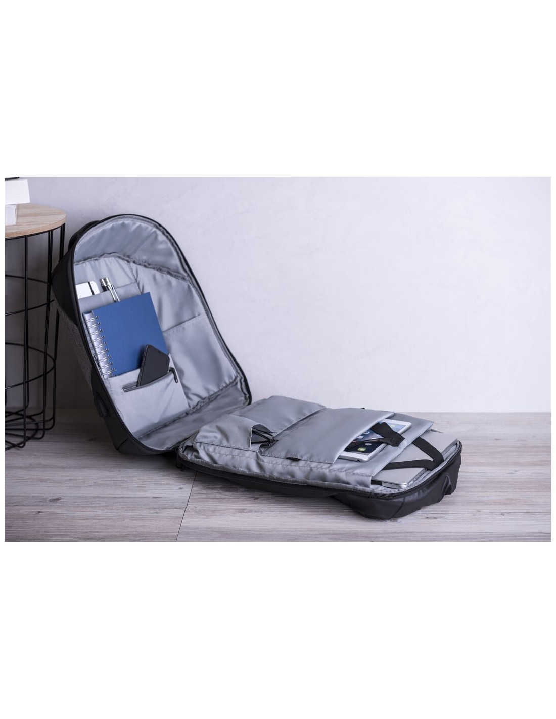 Mochila de negocios antirrobo y repelente al agua en nylon de alta calidad, resistente a cortes y a roces. Con bolsillo antirrobo en la espalda para guardar objetos de valor. Compartimento interior con salida USB para conexión de powerbank -no incluido-. Incluye cable micro USB de 1 metro de largo para total comodidad en la carga de cualquier dispositivo móvil. Bolsillo en cinta derecha con fácil acceso para tarjeta de transporte y otros documentos de uso frecuente. Apertura total 180º para fácil acceso al interior de la mochila. Dos compartimentos interiores independientes y acolchados para ordenador portátil de hasta 15 pulgadas y para tablets de hasta 10 pulgadas. Con multitud de bolsillos interiores y exteriores. Cintas de hombros y espalda con acolchado ergonómico.