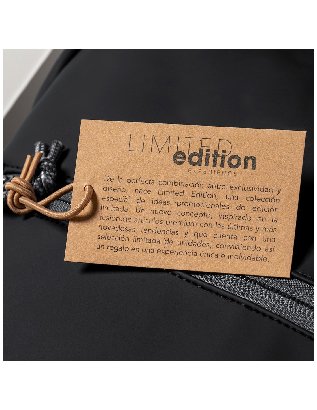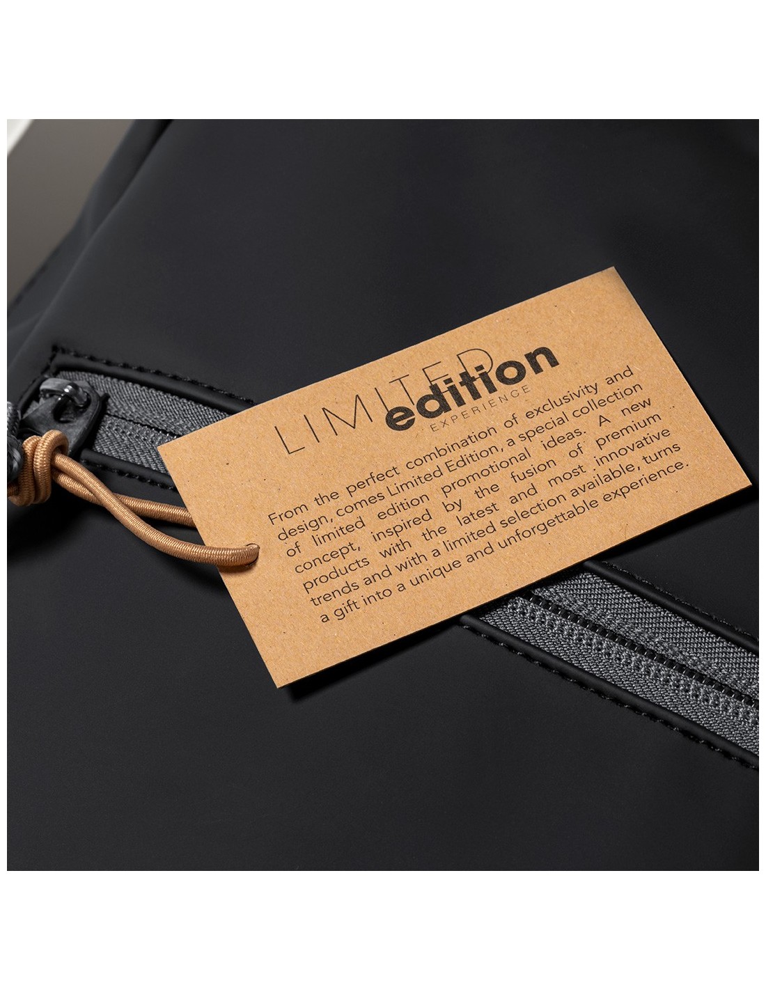 Mochila de la más alta gama colección Limited Edition. Un complemento moderno, funcional y de gran belleza que sobrepasatodas las expectativas. Caracterizada por su elegante y minimalista diseño así como su calidad premium en resistente material texturizado de superficie infinita 600D/PVC. Cierre de cremallera invisible y bolsillo frontal. Con acolchado ergonómico en espalda y cintas de hombros, incluye compartimento interior acolchado para portátil de hasta 15 pulgadas y multiples compartimentos elásticos para una óptima organización de sus accesorios. De la perfecta combinación entre exclusividad y diseño, nace Limited Edition, una colección especial de ideas promocionales de edidición limitada. Un nuevo concepto, inspirado en la fusión de artículos premium con las últimas y más novedosas tendencias y que cuenta con una seleción limitada de unidades, convirtiendo así un regalo en una experiencia única e inolvidable. Exclusivo estuche de presentación Limited Edition, con diseño protegido por derechos de propiedad industrial. Incluida tarjeta con descripción de Limited Edition en cartón reciclado.