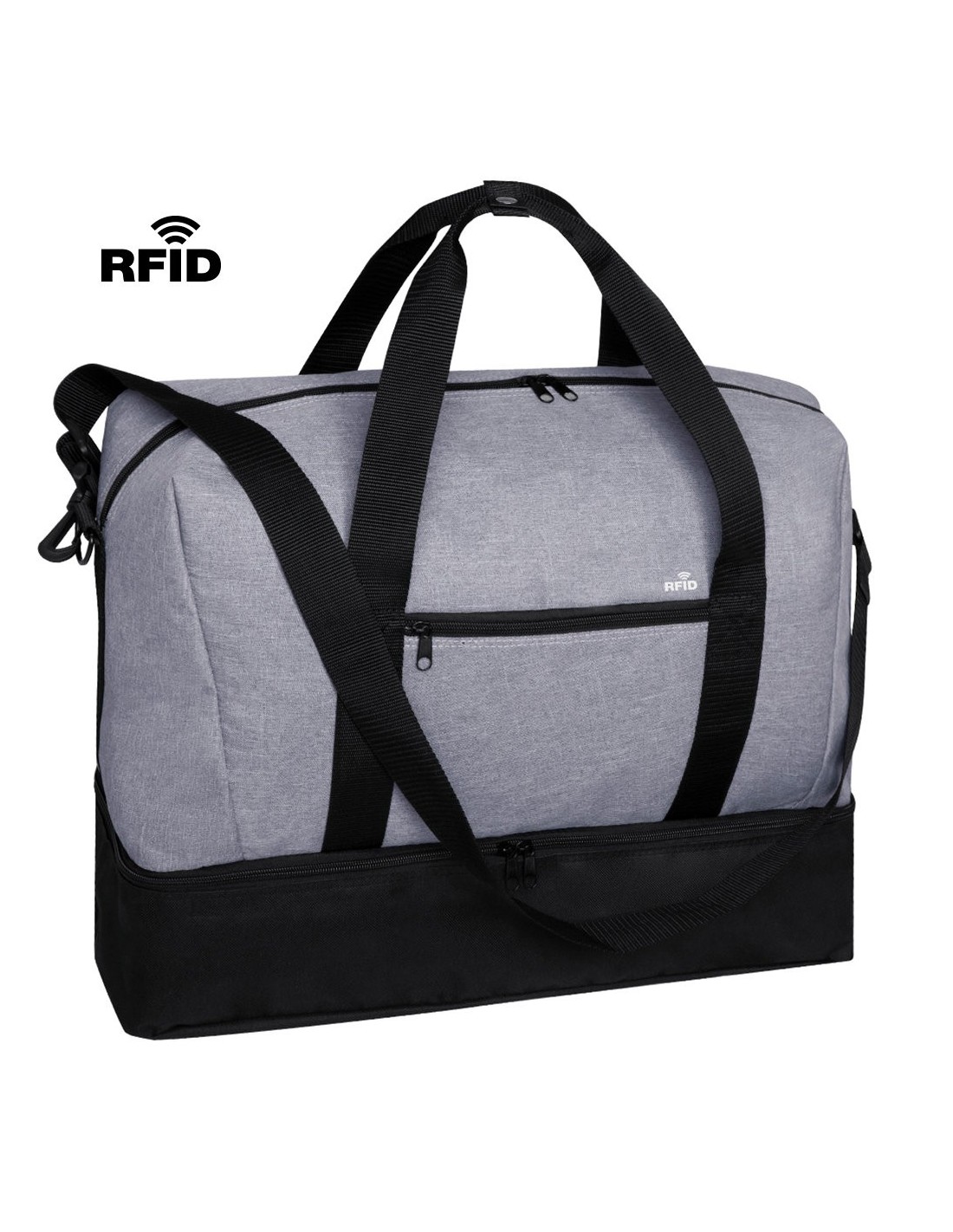 Bolso multiusos en resistente poliéster 600D de acabado denim. De diseño urbano, incluye bolsillo con tecnología de seguridad RFID (Identificación por Radio Frecuencia) que mantiene seguros tus dispositivos de transmisión de identidad. Compartimento independiente de cierre de cremallera para el calzado y bolsillo lateral de cremallera. Compartimento principal con cierre de cremallera de doble tirador y asas de transporte reforzadas, con cierre de botón. Refuerzo de nylon alrededor del cuerpo y cinta bandolera ajustable.