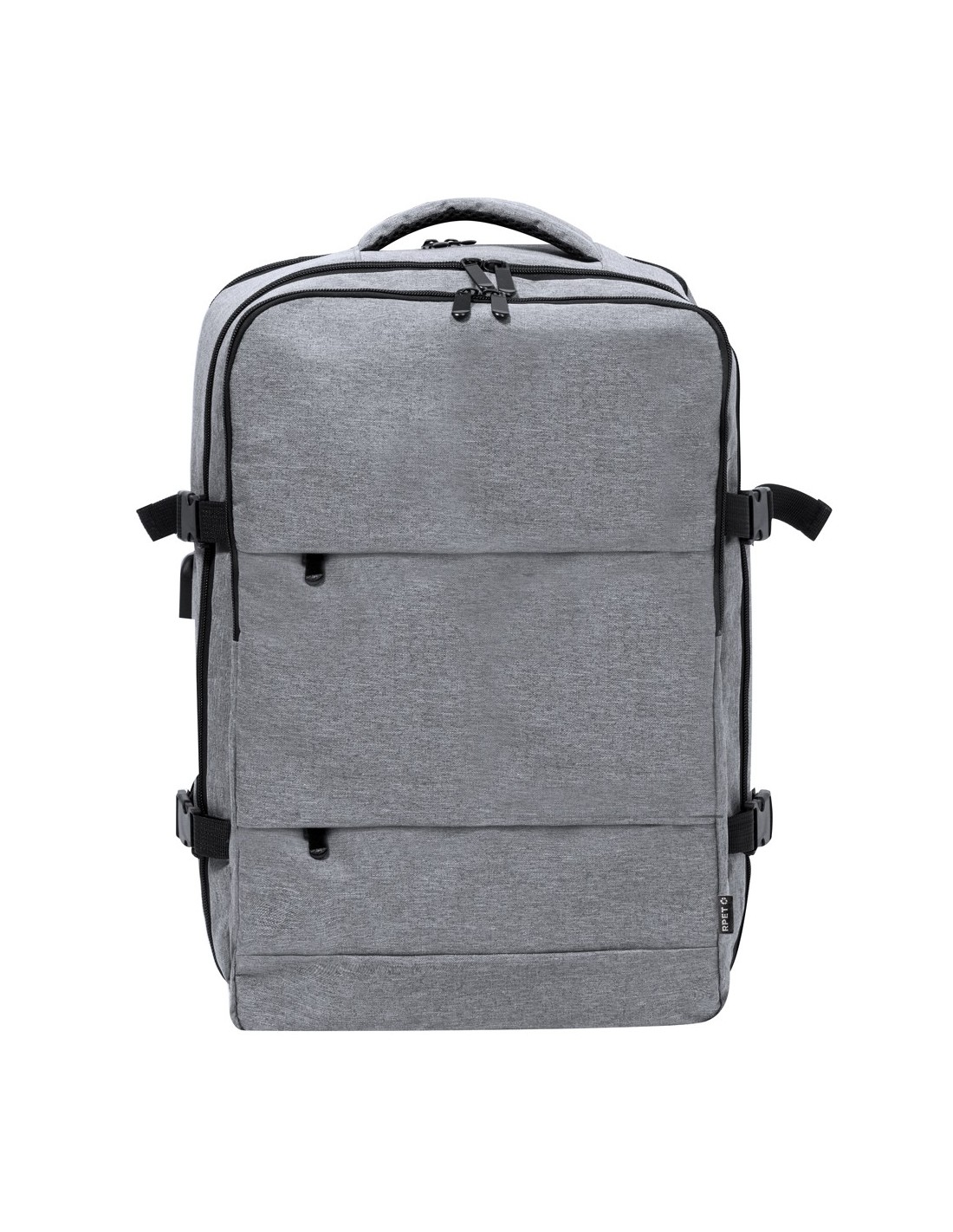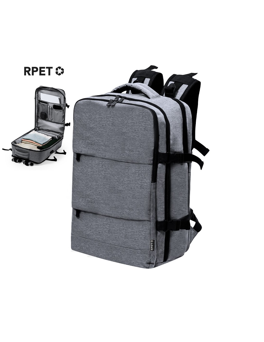 Mochila multifunción fabricada en 300D RPET. Elaborada con poliéster reciclado y resistente al agua, cuenta con una excelente transpirabilidad en la zona trasera, facilitando la disipación del calor gracias a sus cintas y respaldo acolchados. Las cintas anchas están diseñadas para aliviar la presión en los hombros, permitiendo llevar la mochila cómodamente durante largos periodos..Perfecta para cualquier situación por tener múltiples compartimentos: .2 bolsillos frontales. .3 compartimentos grandes centrales, uno de ellos portatodo, un bolsillo central de gran capacidad para guardad ropa y/o complementos con organizador en su interior, y un tercero acolchado, perfecto para llevar portátil de hasta 17,3 pulgadas. .Además, cuenta con 3 apartados especiales, un bolsillo lateral perfecto para tener acceso rápido, bolsillo para calzado en la base con argollas de ventilación, y bolsillo antirrobo en la espalda, además de cable USB. Perfecta para viajes o para el día a día por sus cintas ajustables, adaptándose a todo estilo de vida. Disponible en negro y gris, con logotipo RPET incluido. Presentada individualmente en bolsa reciclada..El material RPET se elabora a partir de plástico reciclado, para así fomentar la reutilización de residuos plásticos y ayudar a la sostenibilidad del planeta.