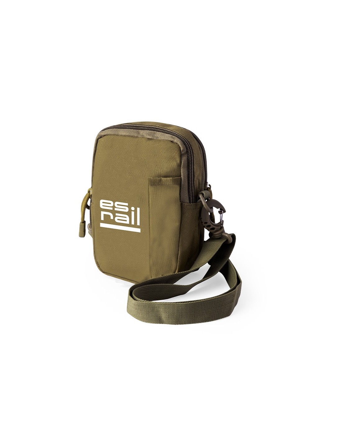 Bandolera en resistente poliéster 800D y tonos marrón arena. Con 2 bolsillos centrales, cierre de cremallera, y parte frontal de rápido acceso. Con cinta bandolera ajustable y presentada individualmente en bolsa reciclada.