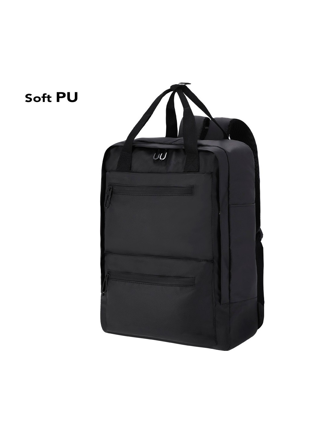 Mochila en resistente PU. Cuenta con un bolsillo principal y dos frontales para un acceso rápido. Cierres de cremallera invisible. Incluye dos bolsillos en los laterales y asas dobles de transporte, reforzadas en la parte superior con cinta de unión entre ellas para un fácil transporte. Equipada con bolsillo acolchado interior para portátil de hasta 15 pulgadas y bolsillo para tablet de hasta 10 pulgadas. Espalda y cintas de hombros acolchadas, transpirables y ajustables.