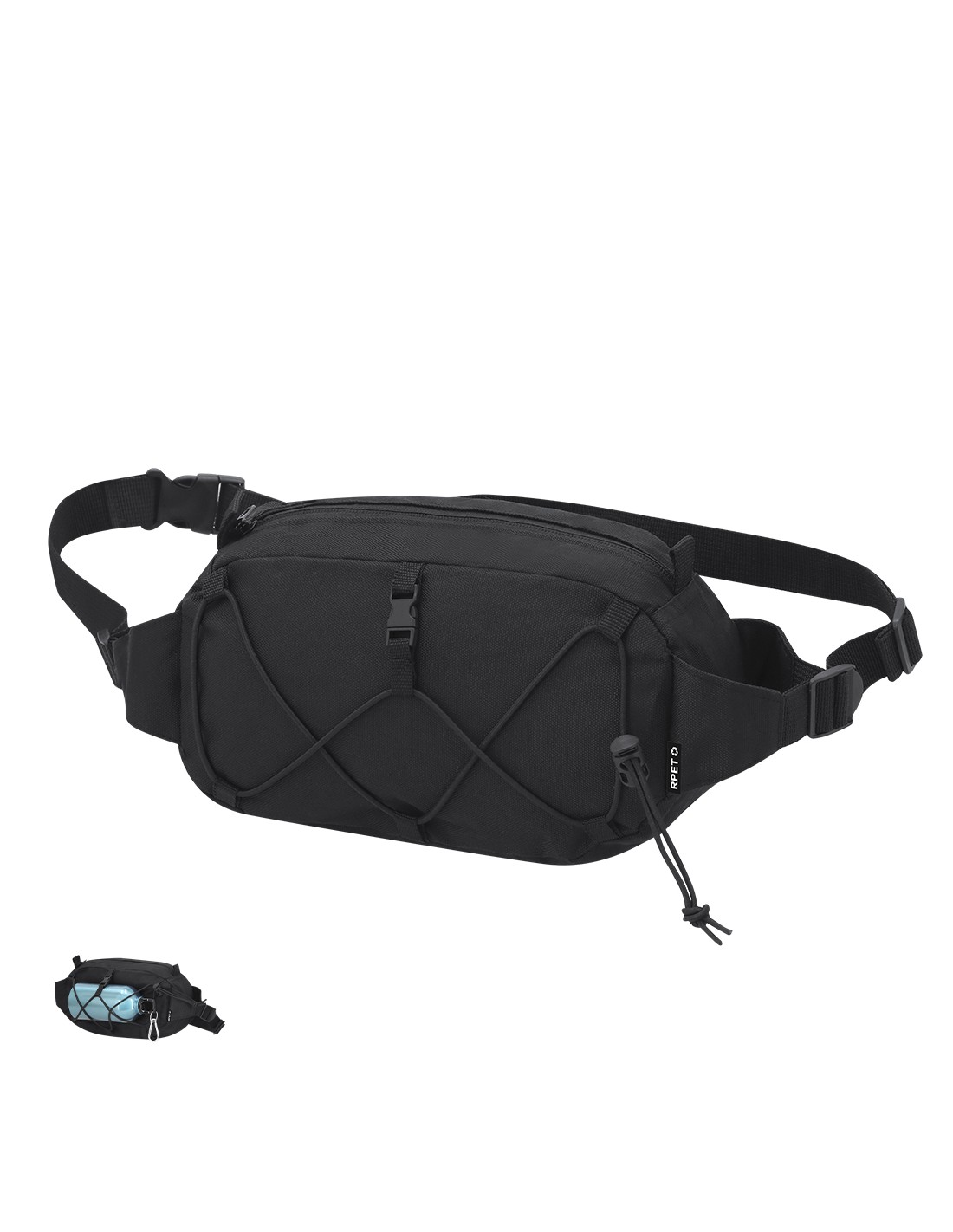 Riñonera fabricada en poliéster RPET 600D. Cuenta con un bolsillo principal con cierre de cremallera invisible en color negro, con tirador metálico en negro, y cinta ajustable con cierre de hebilla en la correa. En la parte frontal incluye un cordón elástico ajustable. Incluye etiqueta distintiva de RPET.