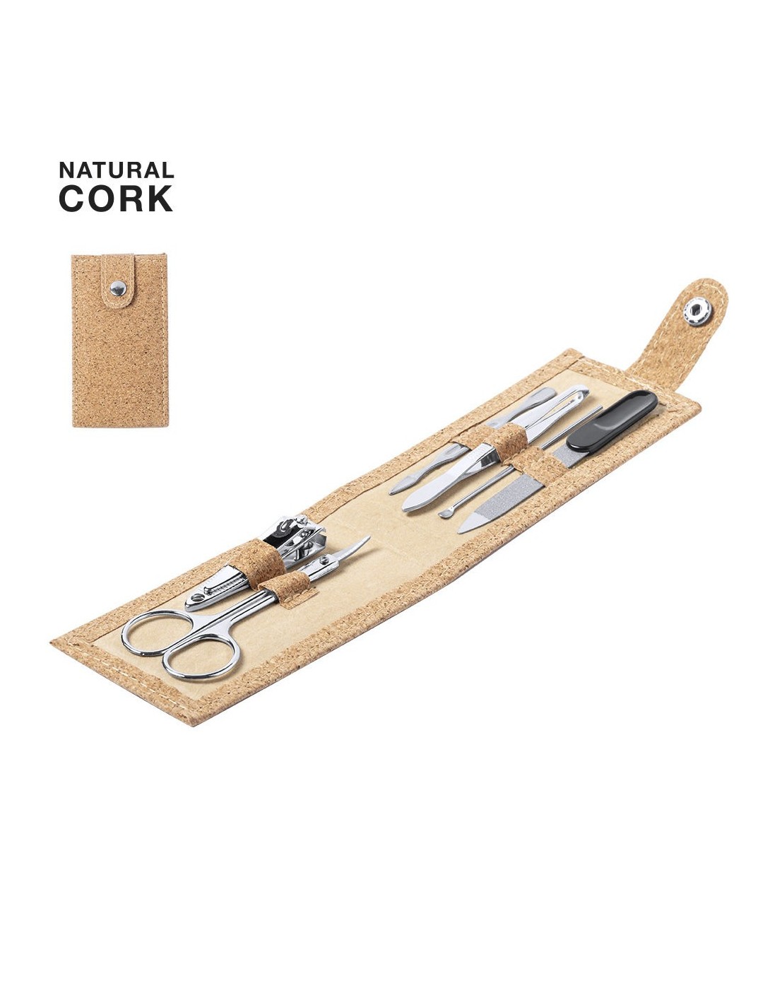 Set de manicura de línea nature con funda fabricada en corcho, para así fomentar la utilización de materias primas naturales y reducir las emisiones contaminantes. Incluye 6 accesorios de acero inox: tijeras, pinzas, cortaúñas, lima y 2 quitacutículas. Soportes interiores para accesorios y cierre de corchete. Totalmente desplegable para fácil marcaje.