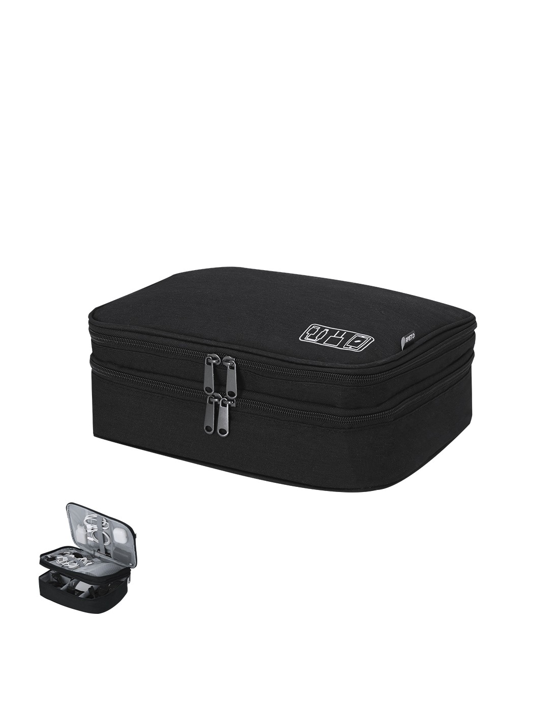 Estuche organizador de gran tamaño fabricado en RPET 600D. Incluye 3 bolsillos de apertura completa con doble tirador metálico y equipado con múltiples tipos de bolsillos interiores. Incluye asa para fácil transporte. Con distintivo RPET.