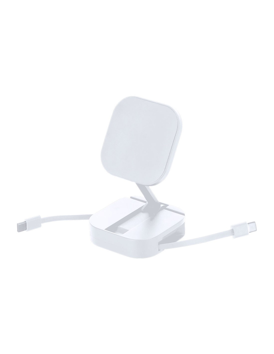 Cable cargador soporte magnético 2 en 1 de 60W, fabricado en ABS reciclado (RABS). Diseñado para la carga simultánea del smartphone a través del soporte magnético y mediante cable. Cuenta con soporte plegable con ajuste de posición. Cable retráctil de 80 cm con función de carga y transferencia de datos compatible con dispositivos que cuenten con entrada USB-C.
