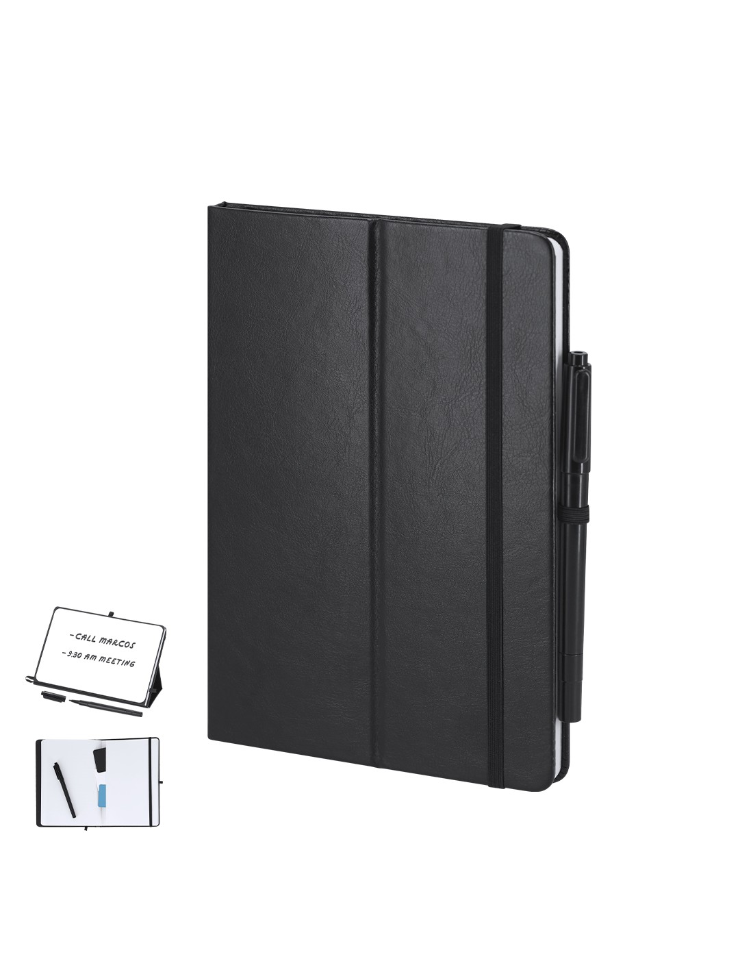 Bloc de notas pizarra en PU reciclado. Con pizarra en primera página, incluye bolígrafo rotulador y borrador en tinta negra. Con 80 hojas a disposición de una raya. Portada plegable con función soporte, y cinta elástica para cierre seguro.Ideal para tomar notas rápidas, apuntes, crear diseños en tu jornada laboral o en casa.Incluye distintitov logo PU Reciclado.
