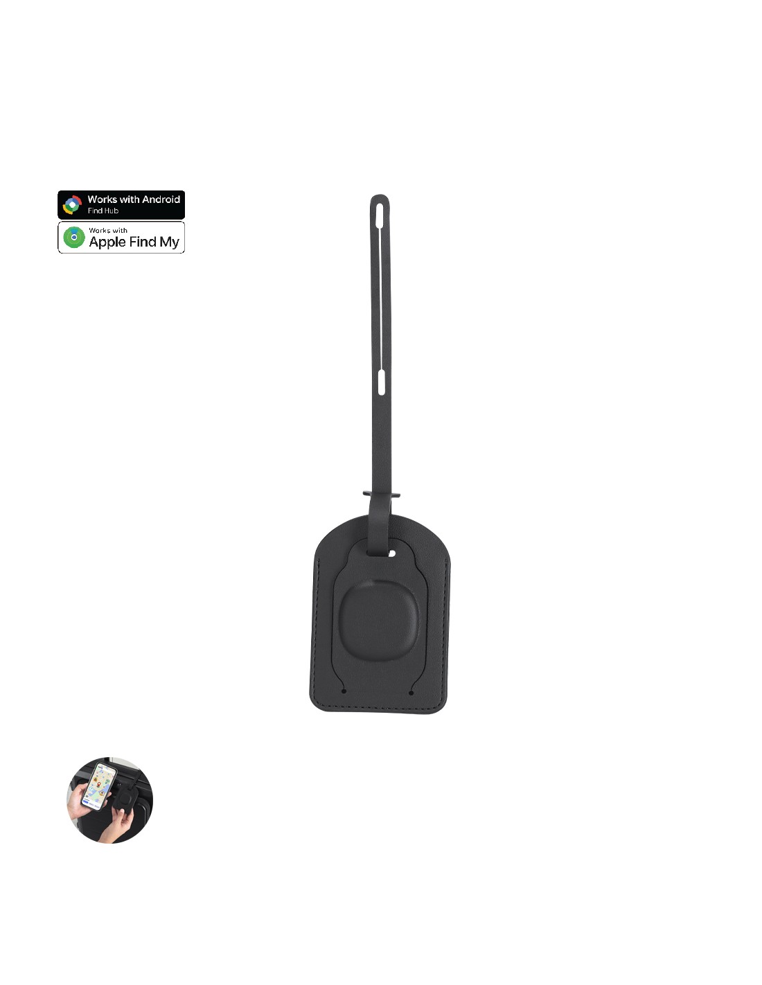 Identificador maletas localizador inteligente con elegante diseño en PU. Dispone de cinta para poner en maleta. Con sistema Apple Find My y Android Find Hub for Android, función anti-pérdida, que permite identificar la ubicación de los objetos asociados mediante la activación del modo búsqueda en los dispositivos vinculados en la APP. Pila de botón incluida.