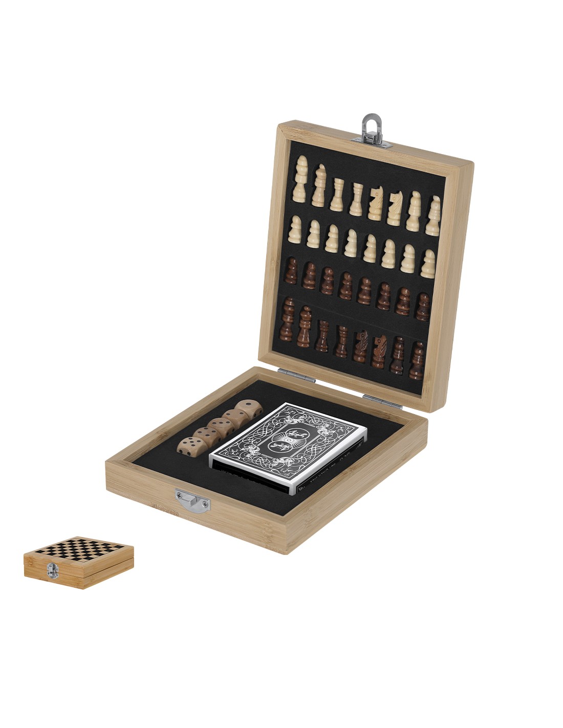 Set de juegos con acabado en bambú y diseño en forma de tablero de ajedrez. Incluye cierre de seguridad, juego de ajedrez, dados y cartas de póker. Presentado en un elegante estuche con tablero de ajedrez y un interior de espuma troquelada.
